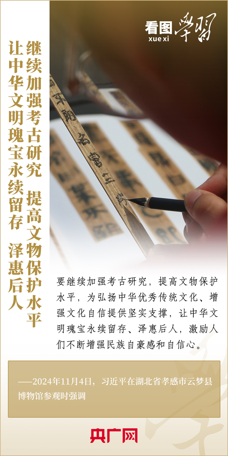 11月4日,習近平總書記在湖北省孝感市云夢縣博物館參觀出土秦漢簡牘展。這里收藏的我國考古史上首次發現的秦簡——云夢睡虎地秦簡,反映了戰國晚期到秦始皇時期的政治、經濟、文化、法律、軍事等方面的情況。習總書記詳細聽取簡牘內容、歷史文化價值和保護研究情況介紹,指出要繼續加強考古研究,提高文物保護水平,讓中華文明瑰寶永續留存、澤惠后人。