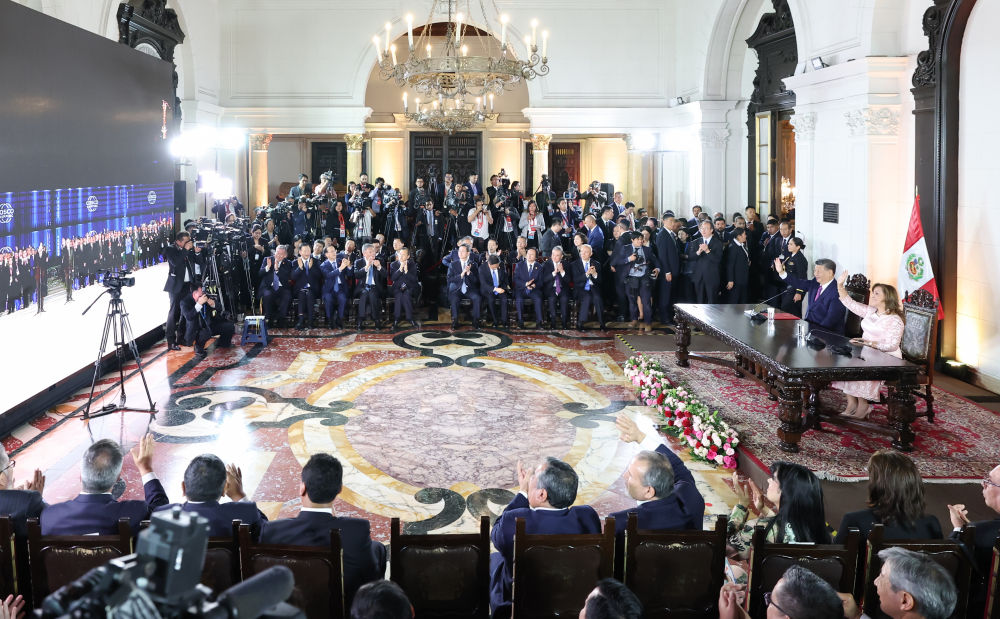 當地時間11月14日晚7時許,秘魯首都利馬總統府一層埃萊斯普魯廳,燈火通明,氣氛熱烈。習近平主席同秘魯總統博魯阿爾特以視頻方式共同出席秘魯錢凱港開港儀式。