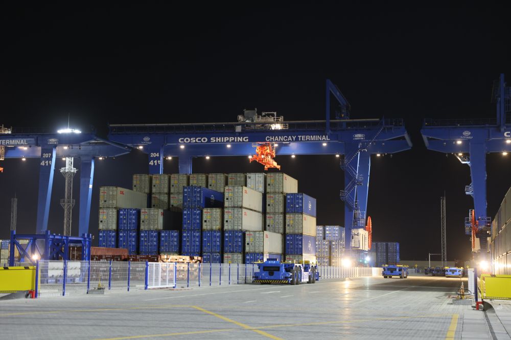 通過大屏幕連線,兩國元首共同下達開港指令。利馬以北80公里的錢凱港,在夜幕中開啟了港口作業。