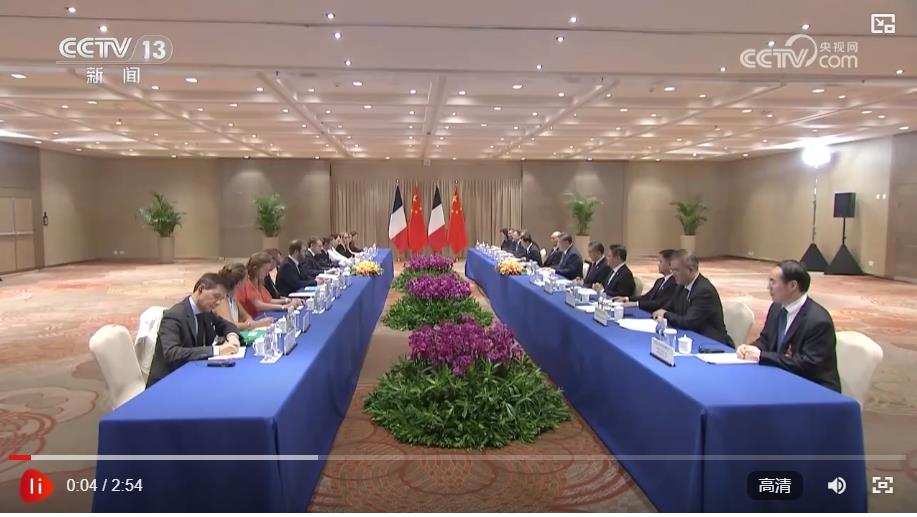 當地時間11月19日上午,國家主席習近平在里約熱內盧出席二十國集團領導人峰會期間會見法國總統馬克龍。