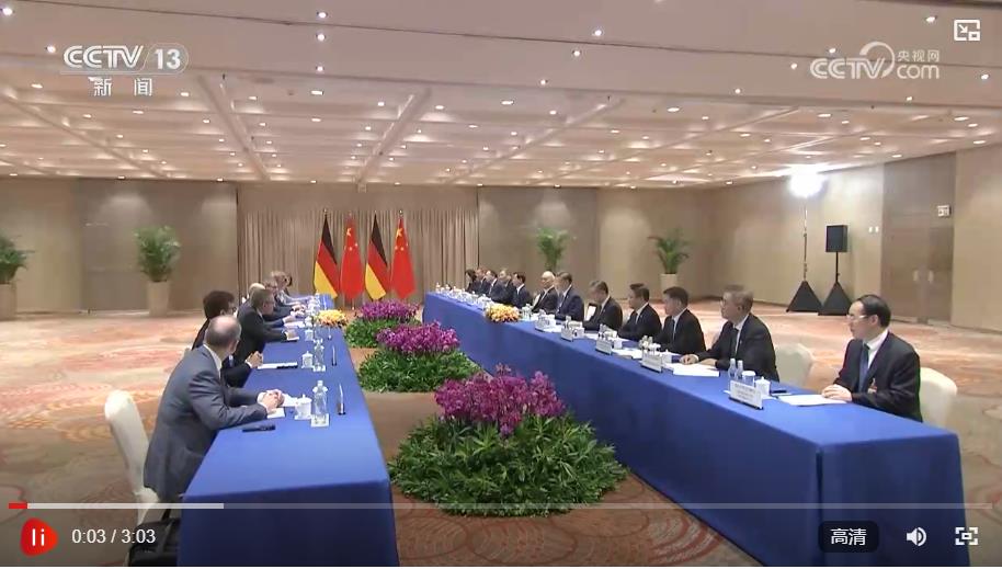 當地時間11月19日上午,國家主席習近平在里約熱內盧出席二十國集團領導人峰會期間會見德國總理朔爾茨。