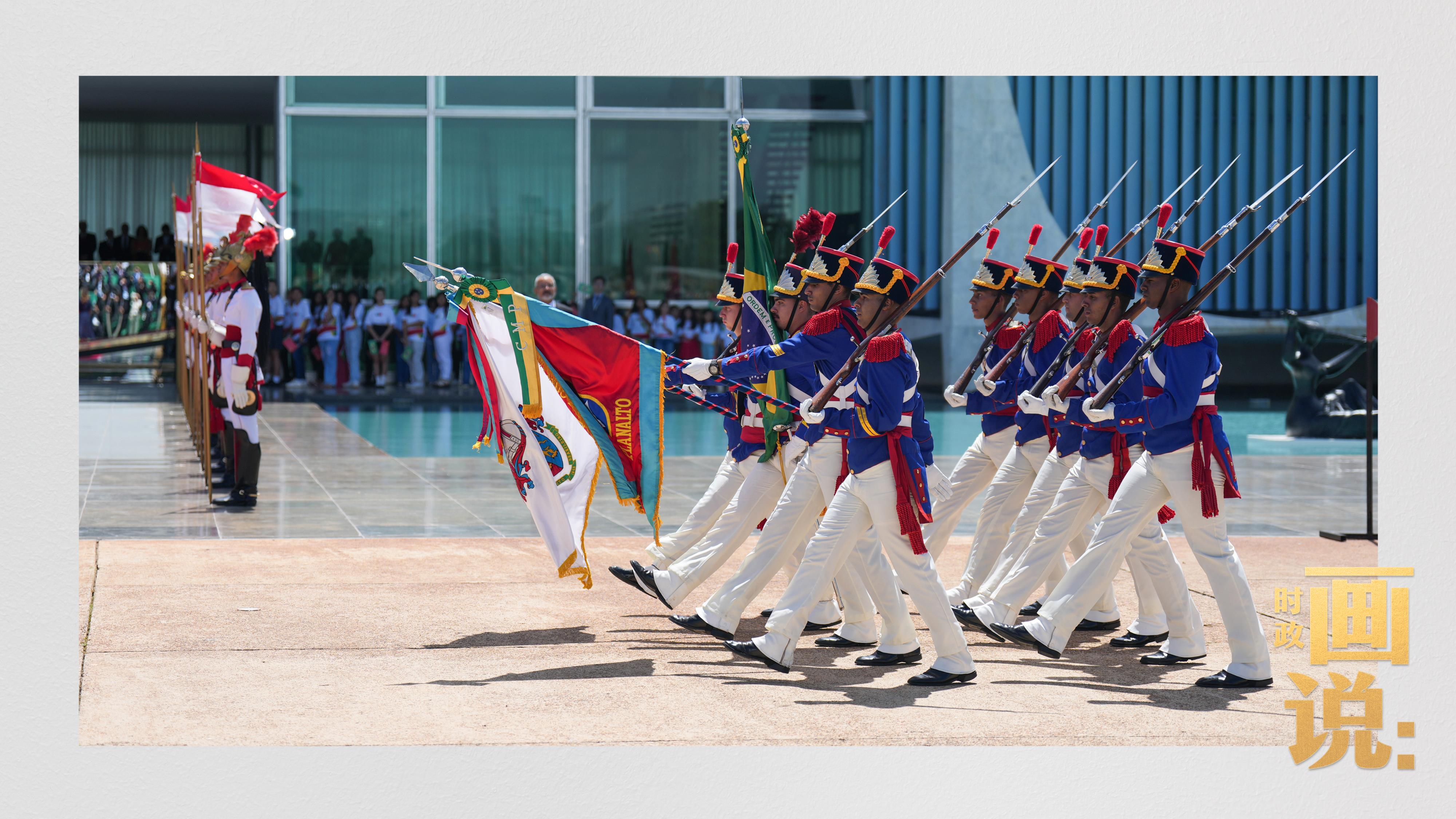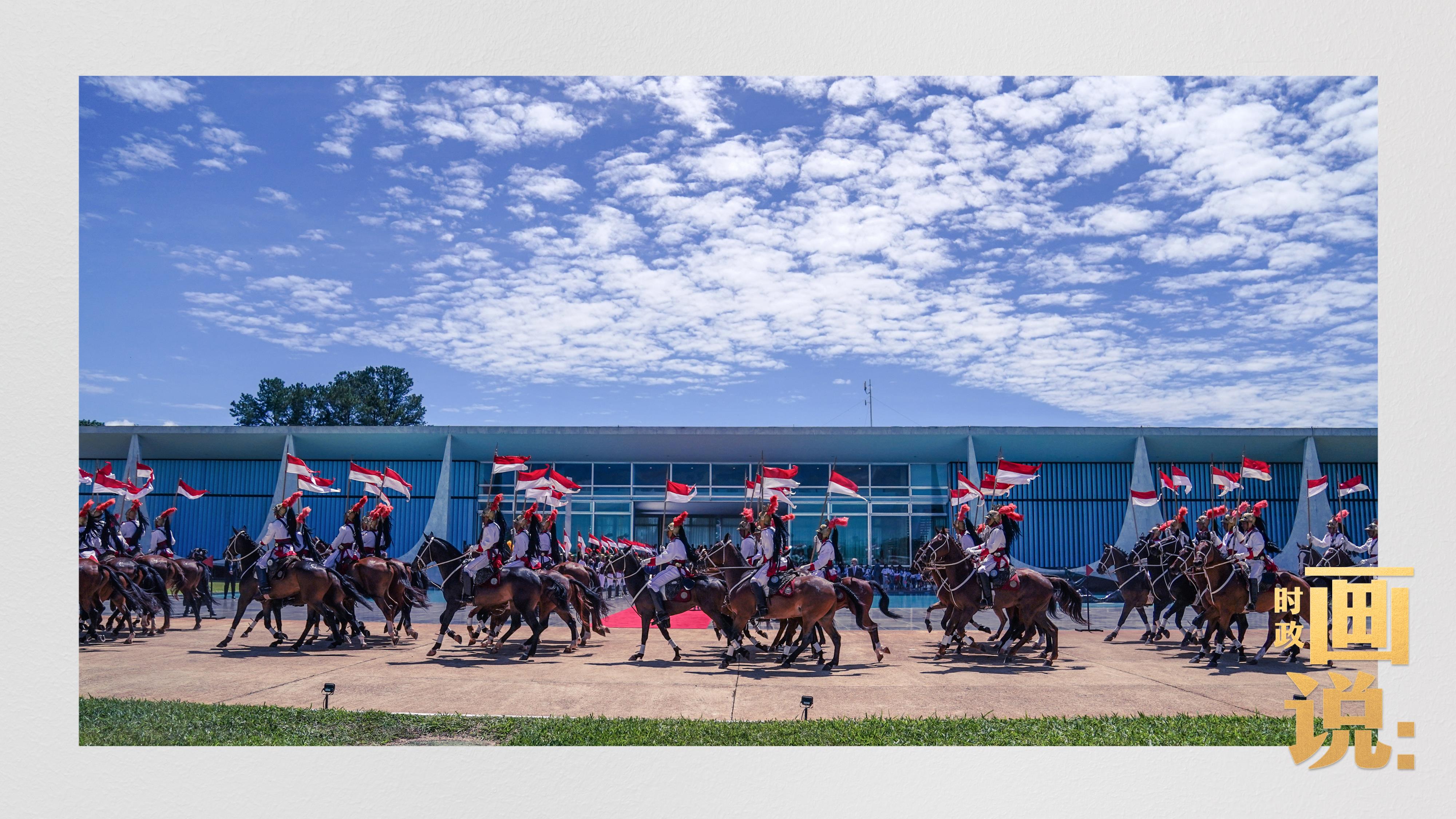 騎兵護衛(wèi)習近平主席專車抵達儀式現(xiàn)場,巴西藝術家用中文深情唱響中國經典民歌《我的祖國》,現(xiàn)場氣氛隆重熱烈。
