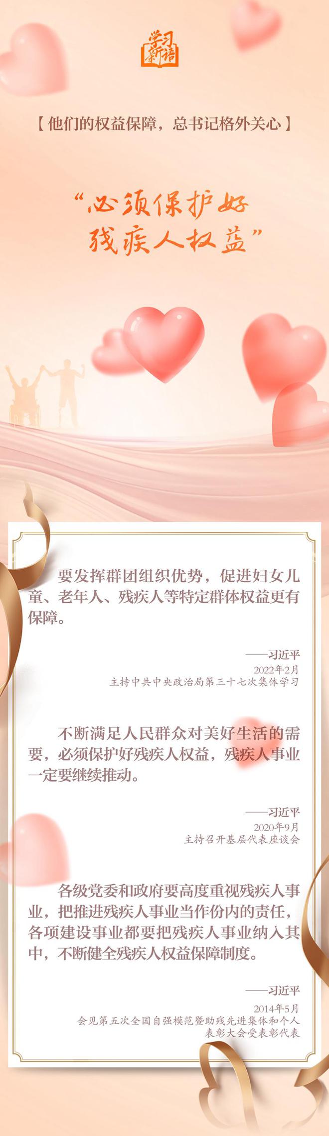 我國(guó)有8500萬(wàn)殘疾人。在習(xí)近平總書(shū)記心中,殘疾人是一個(gè)特殊困難的群體,需要格外關(guān)心、格外關(guān)注。總書(shū)記的一句句溫暖話語(yǔ)、一次次深情囑托,讓廣大殘疾人心田滋潤(rùn)、滿(mǎn)懷希望。