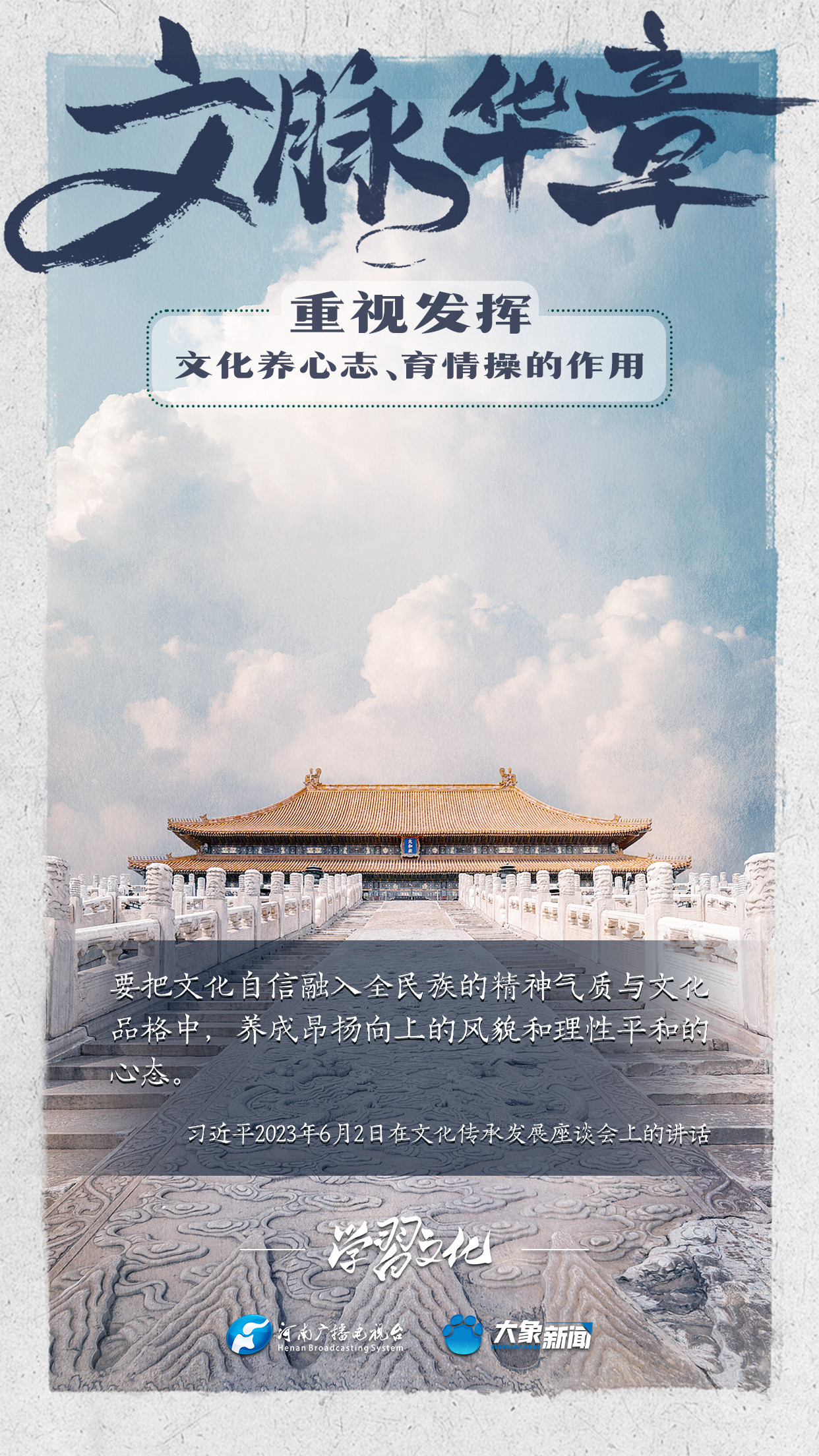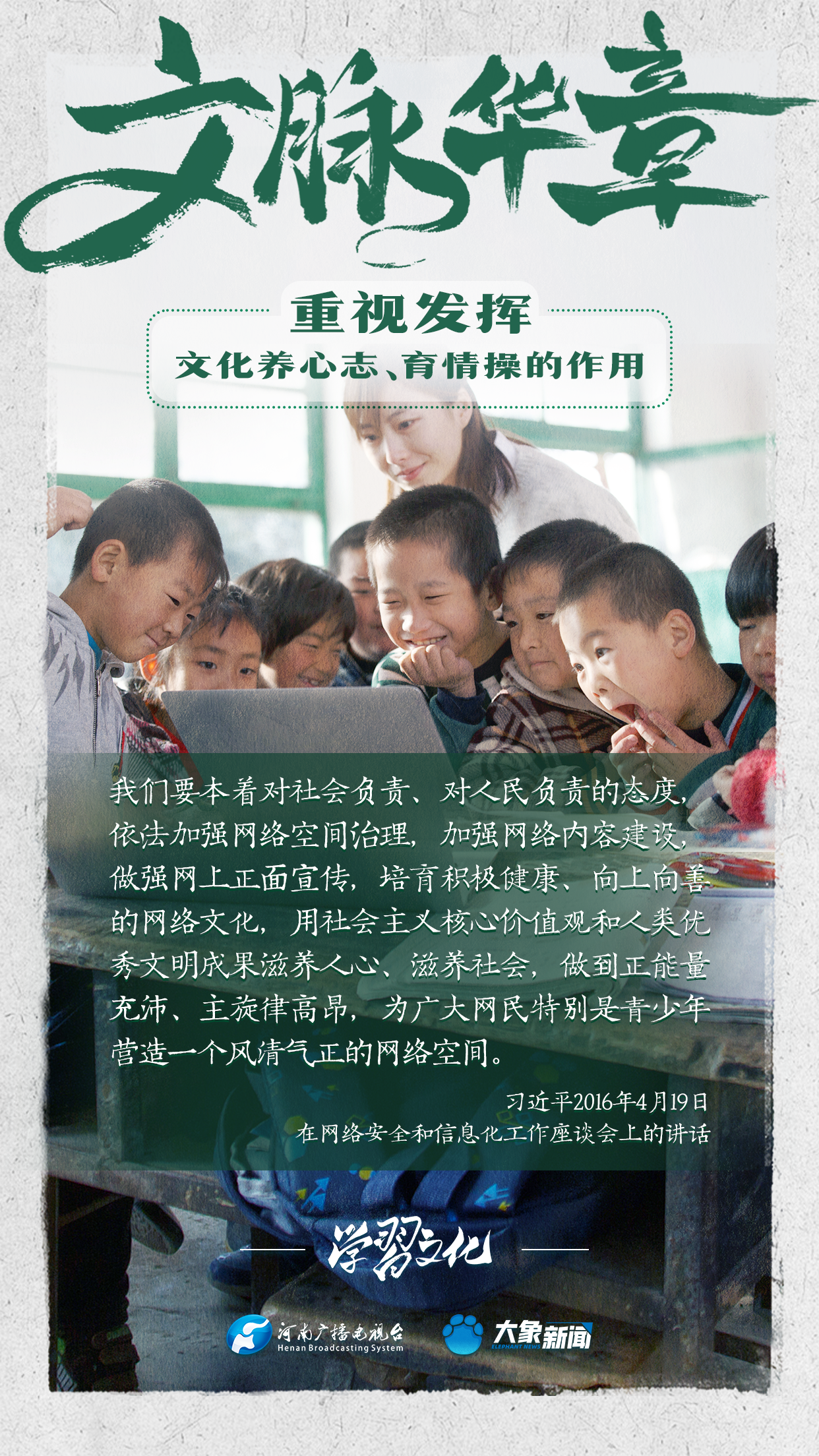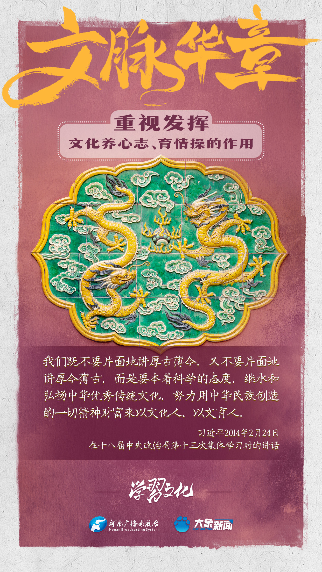 習近平總書記在主持中共中央政治局第十七次集體學習時強調,重視發揮文化養心志、育情操的作用,涵養全民族昂揚奮發的精神氣質。總書記高度重視文化的作用,發表了一系列重要講話,倡導以文載道、以文傳聲、以文化人。我們一起學習。