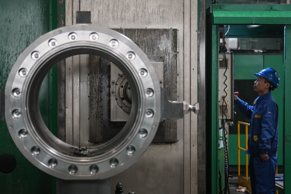 2024年1月11日,工人在大連華銳船用曲軸有限公司加工車間加工產品。新華社記者 潘昱龍 攝