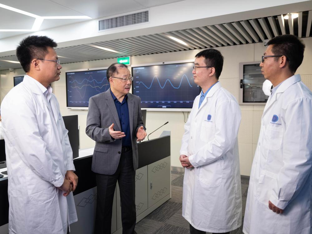 12月4日,澳門空間技術與應用研究院院長張可可(左二)和“澳科一號”衛星項目助理研究員尹亮(右二)交流。新華社發(張金加 攝)