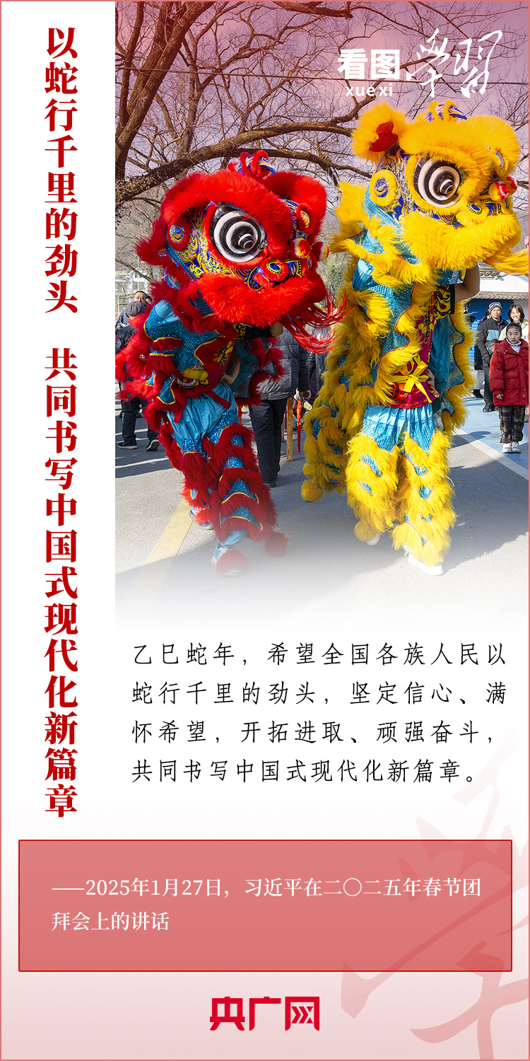 1月27日,中共中央、國(guó)務(wù)院在北京舉行春節(jié)團(tuán)拜會(huì),習(xí)近平總書(shū)記發(fā)表熱情洋溢的講話,向全國(guó)各族人民、港澳臺(tái)同胞、海外僑胞拜年并致以新春祝福。總書(shū)記在講話中深情回顧過(guò)去一年中國(guó)式現(xiàn)代化取得很不平凡的發(fā)展歷程,“希望全國(guó)各族人民以蛇行千里的勁頭,堅(jiān)定信心、滿懷希望,開(kāi)拓進(jìn)取、頑強(qiáng)奮斗,共同書(shū)寫(xiě)中國(guó)式現(xiàn)代化新篇章。”一起來(lái)學(xué)習(xí)!