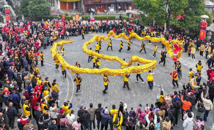 △1月29日,在湖南湘西土家族苗族自治州鳳凰縣文化廣場,群眾舞龍歡慶新年。
