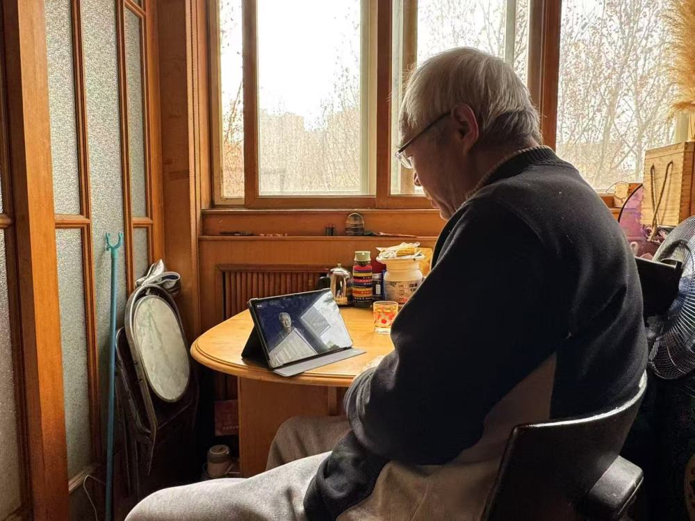 2025年1月26日,天津市南開區的老人崔金海正在同小云健康陪伴智能機中的虛擬“同伴”聊天。新華社記者 梁姊 攝