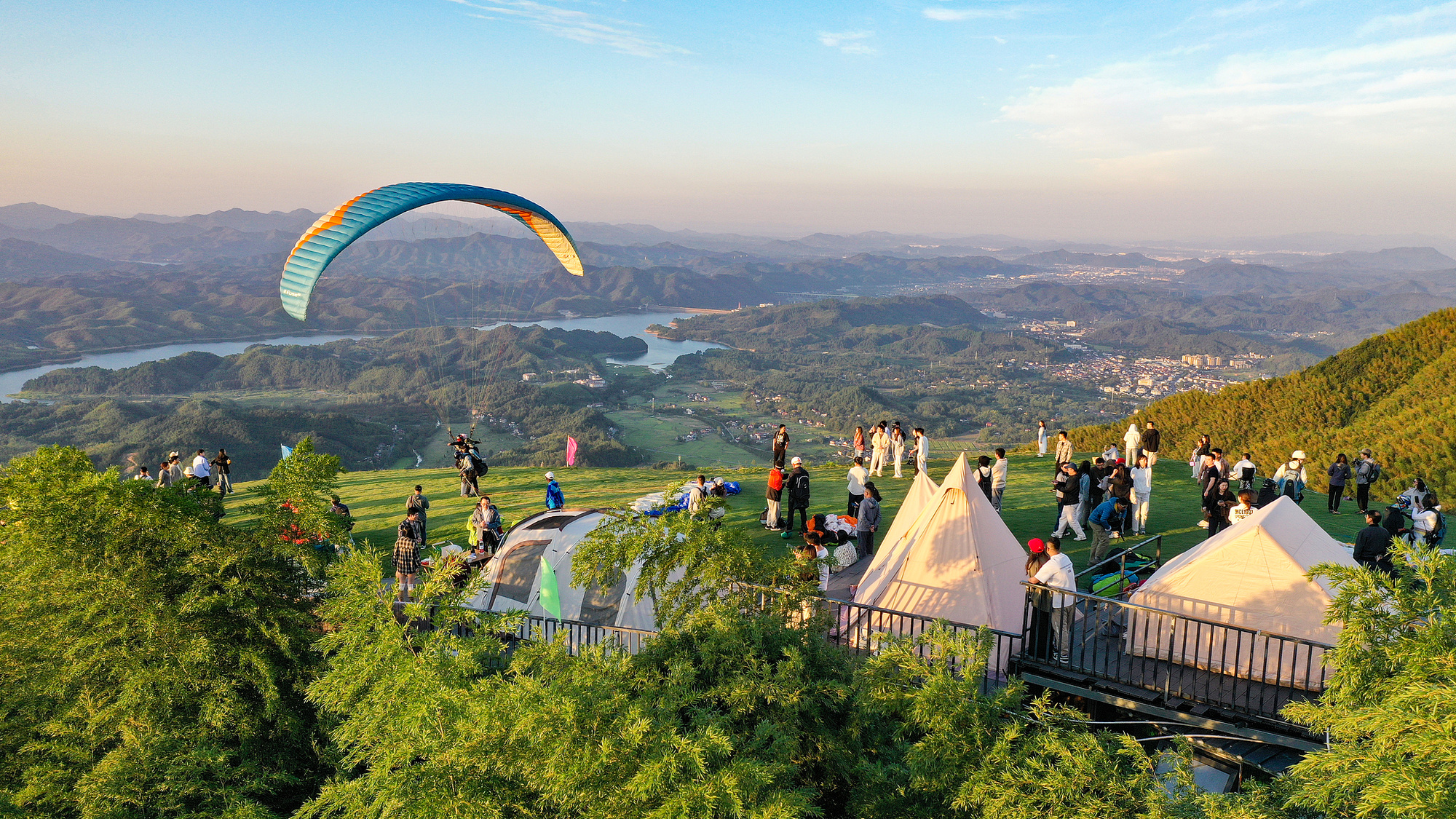 浙江安吉:游客乘坐滑翔傘領略自然風光