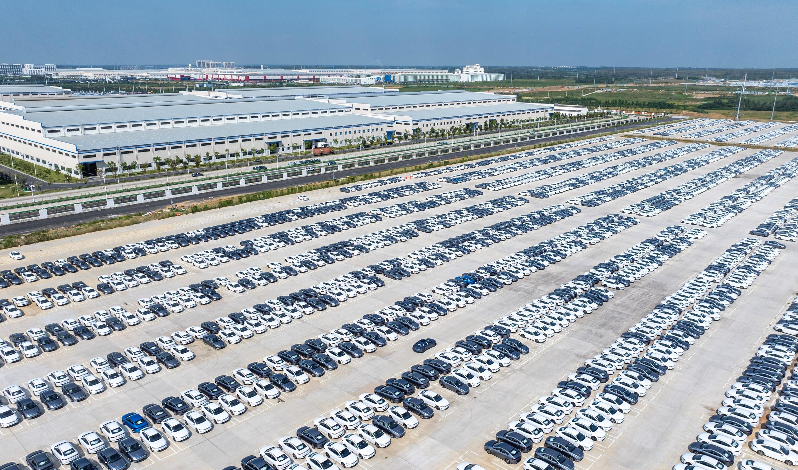 2024年9月,安徽合肥,整齊停放的新能源汽車正在等待裝車銷往國內外市場。