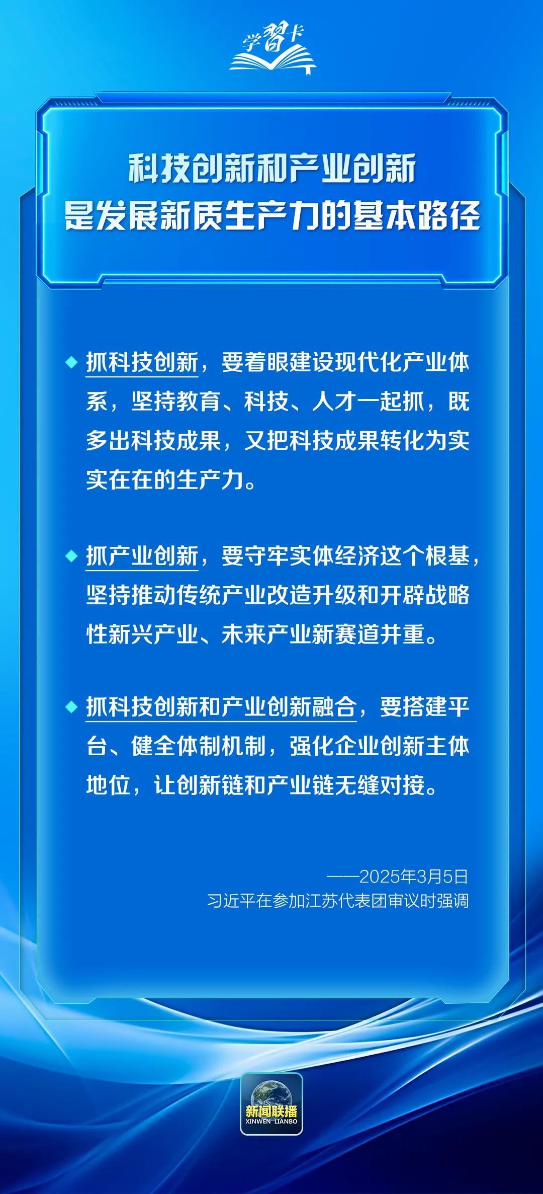 2025年全國兩會期間,習近平總書記參加團組審議討論時,多次提到科技創新這一關鍵命題,強調“科技創新和產業創新,是發展新質生產力的基本路徑”。一起學習↓