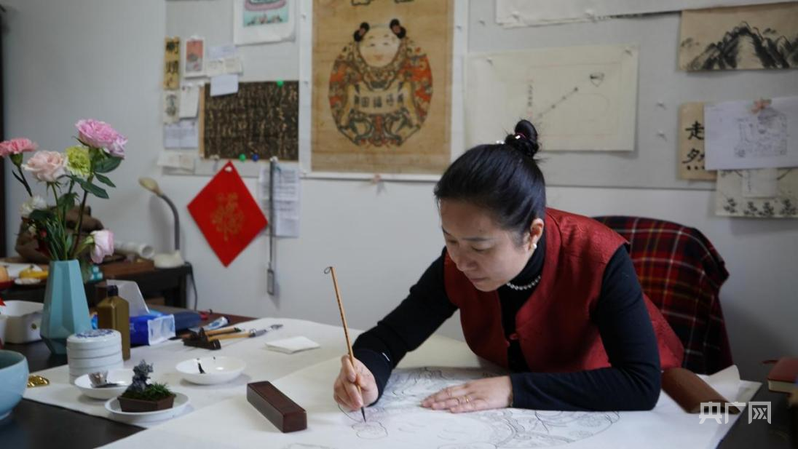 喬蘭蓉正在勾繪《一團和氣》線稿(央廣網記者 王紀民 攝)