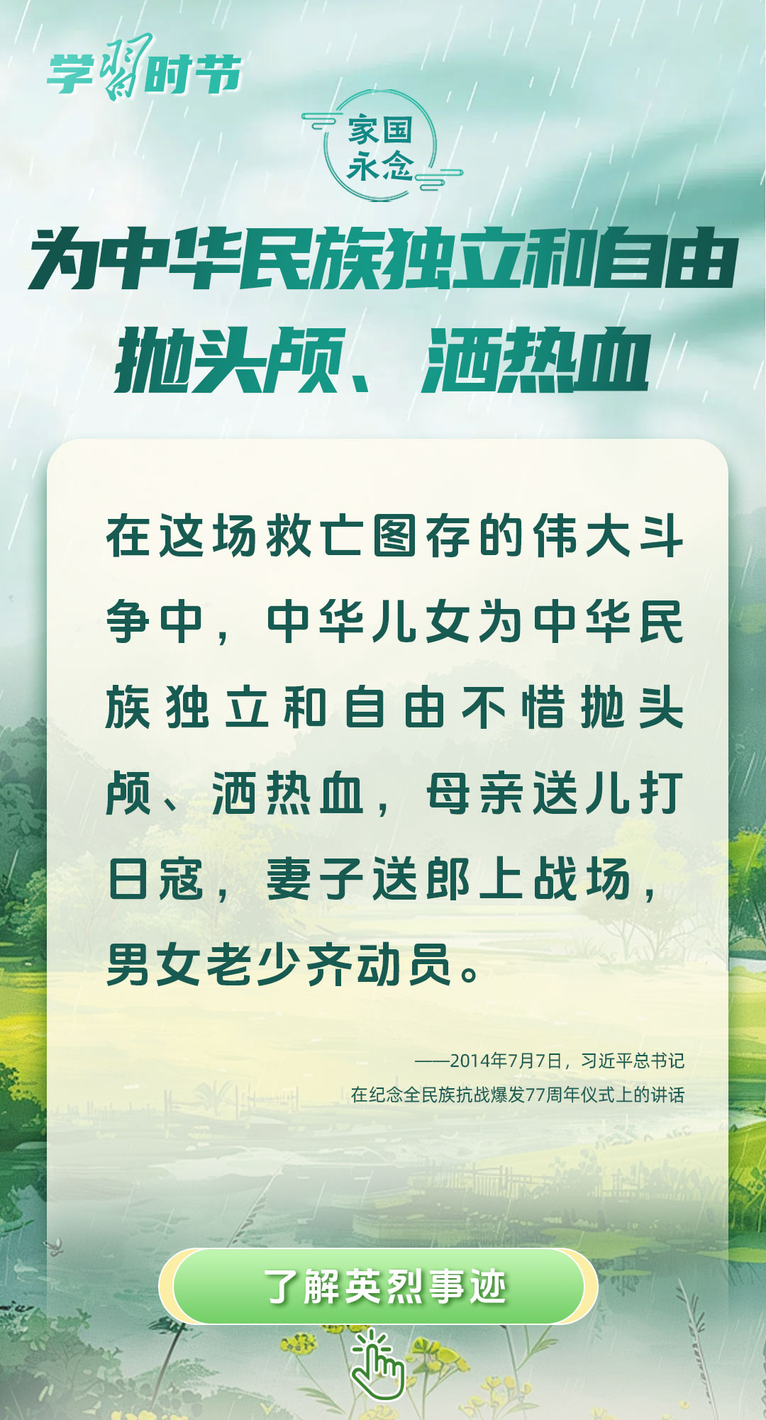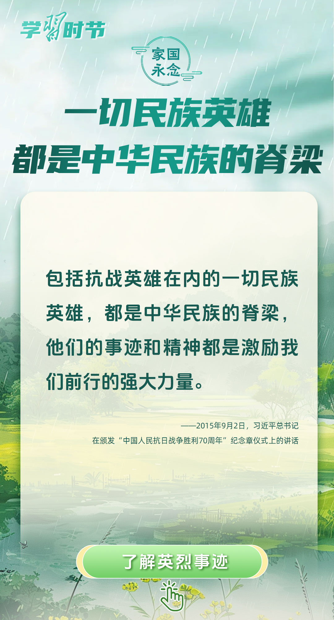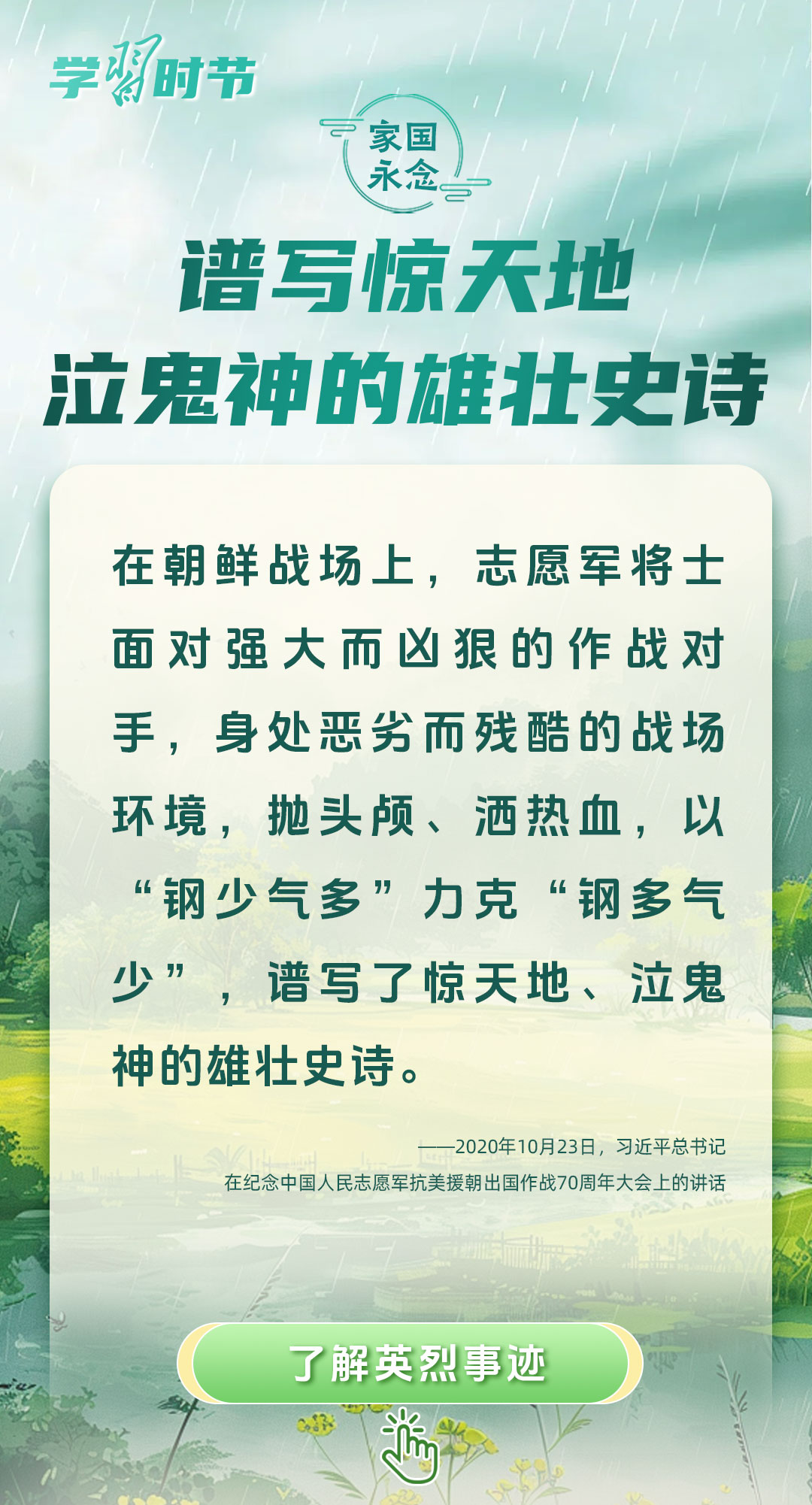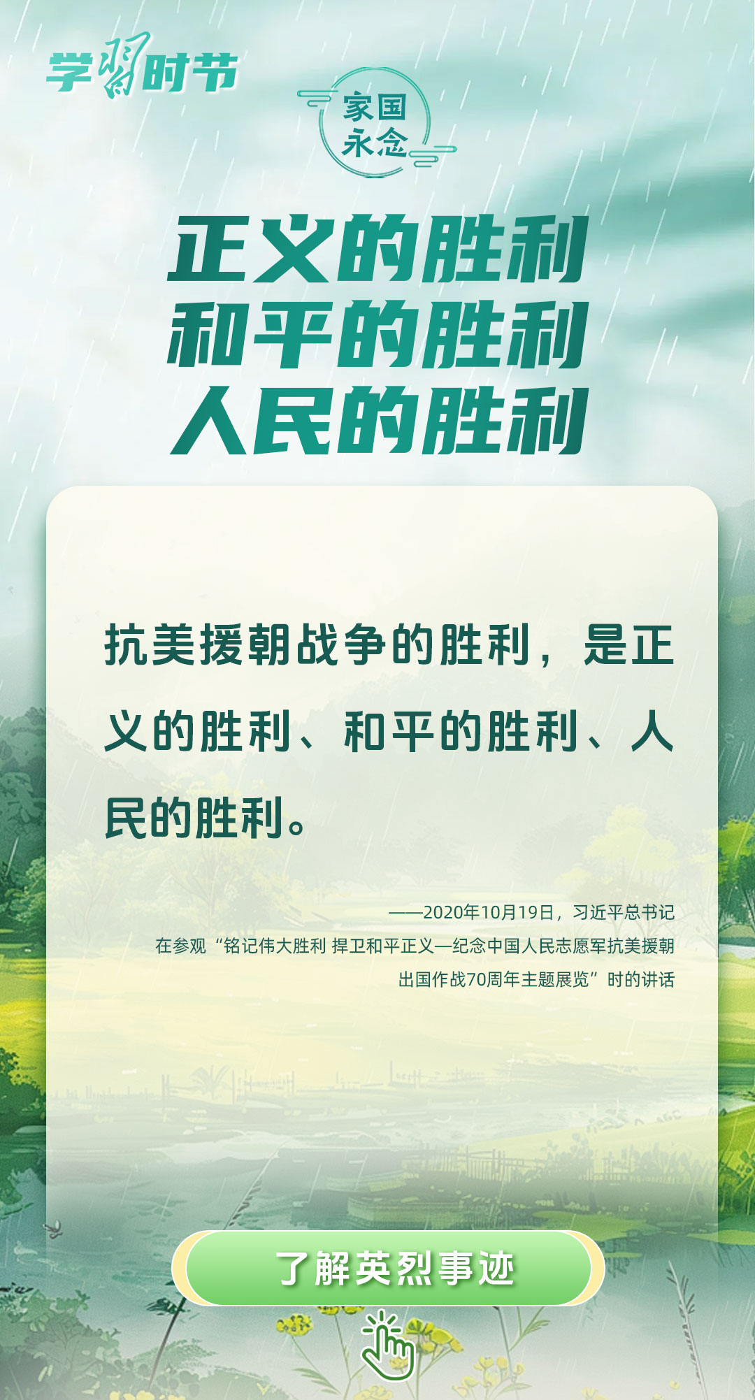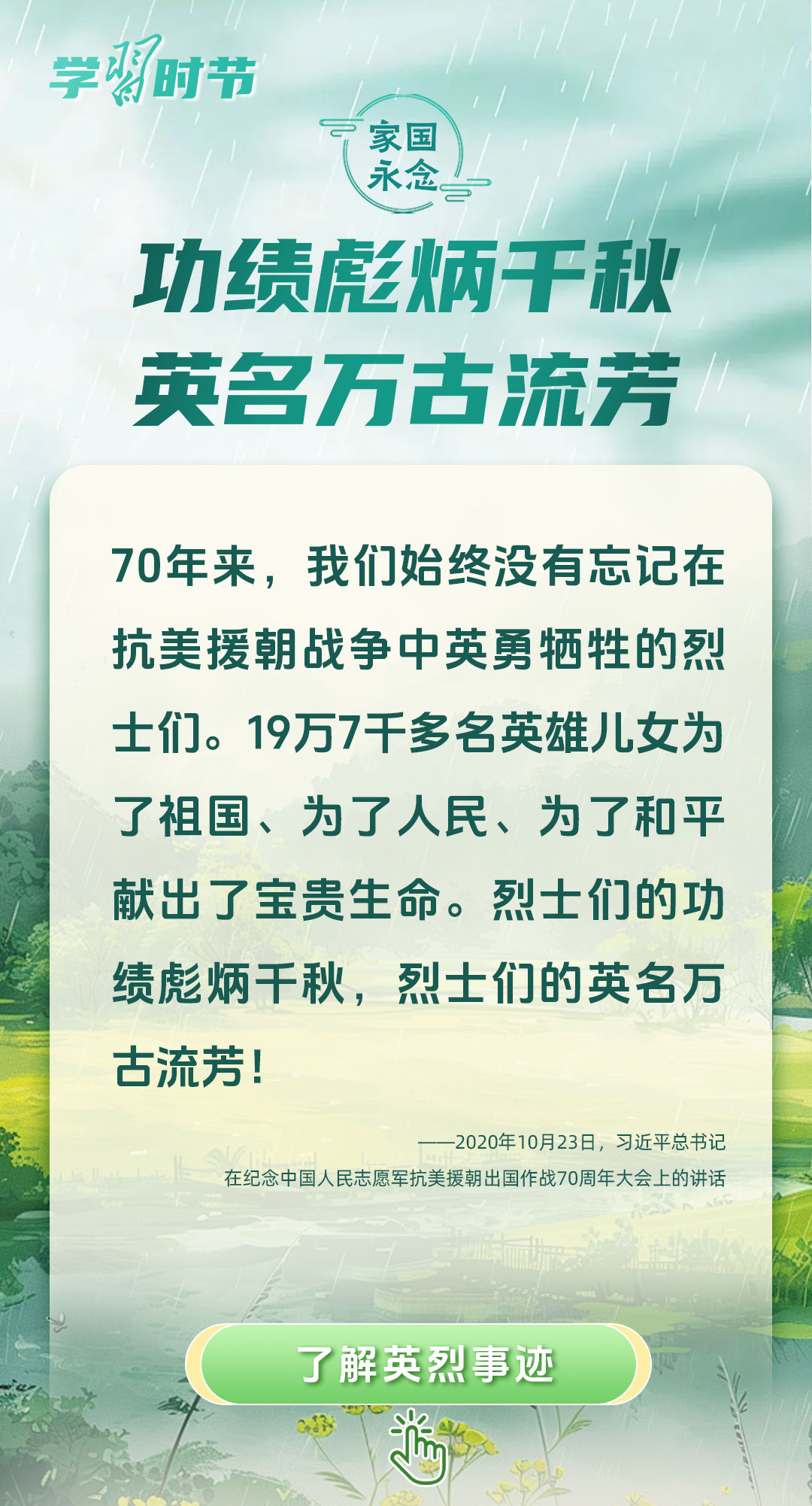 今年是中國人民抗日戰爭暨世界反法西斯戰爭勝利80周年、中國人民志愿軍抗美援朝出國作戰75周年。習近平總書記曾說:“對一切為國家、為民族、為和平付出寶貴生命的人們,不管時代怎樣變化,我們都要永遠銘記他們的犧牲和奉獻?!苯裉煳覀兯鶕碛械囊磺校瑹o不凝結著英雄、英烈們的奉獻付出乃至巨大犧牲。