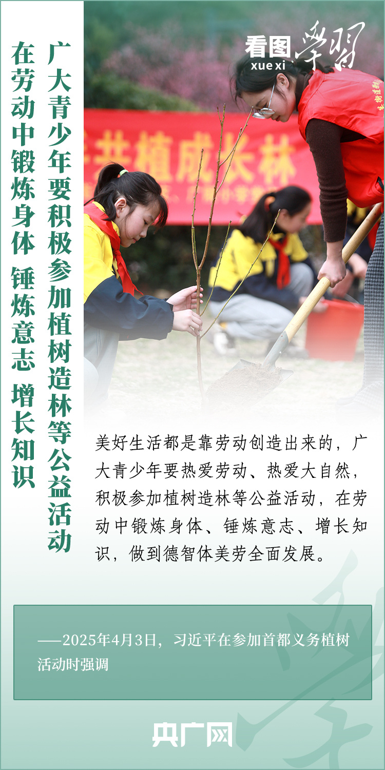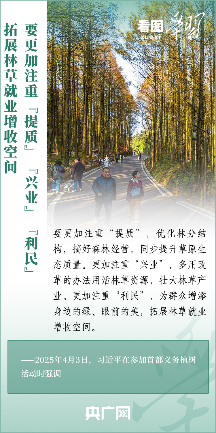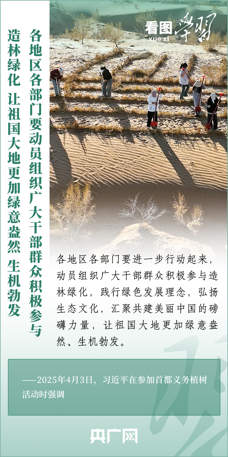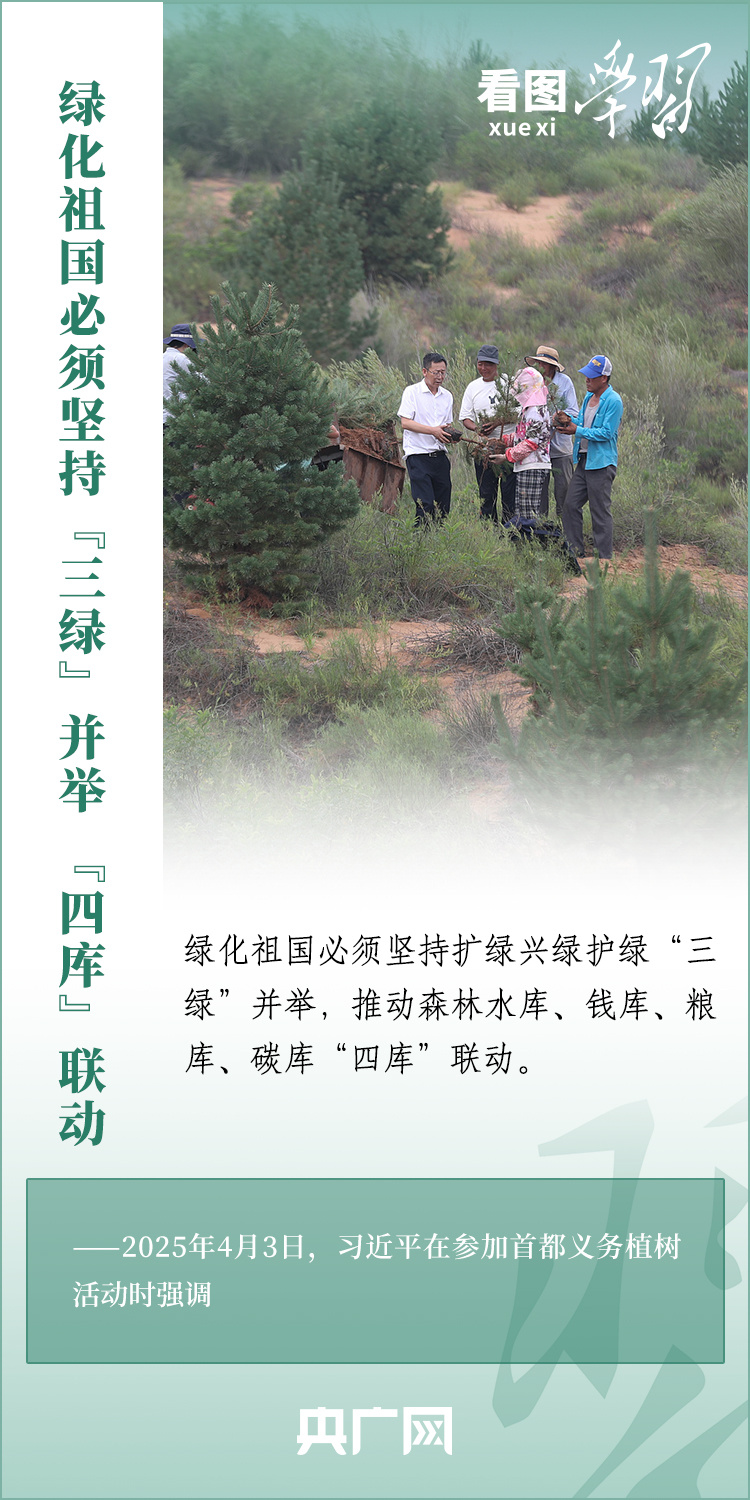植樹造林是生態文明建設重要一環。4月3日,習近平總書記參加首都義務植樹活動。在植樹現場,總書記高度肯定國土綠化工作取得來之不易的成績,強調綠化祖國必須堅持“三綠”并舉、“四庫”聯動,要更加注重“提質”“興業”“利民”,“匯聚共建美麗中國的磅礴力量,讓祖國大地更加綠意盎然、生機勃發”。一起來學習!