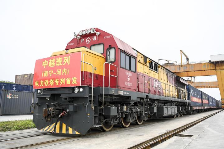2024年3月8日,在廣西南寧國際鐵路港,電力鐵塔專列準備發車。當日,一列滿載340噸電力鐵塔的中越班列從南寧國際鐵路港開出,發往越南河內。新華社記者 曹祎銘 攝