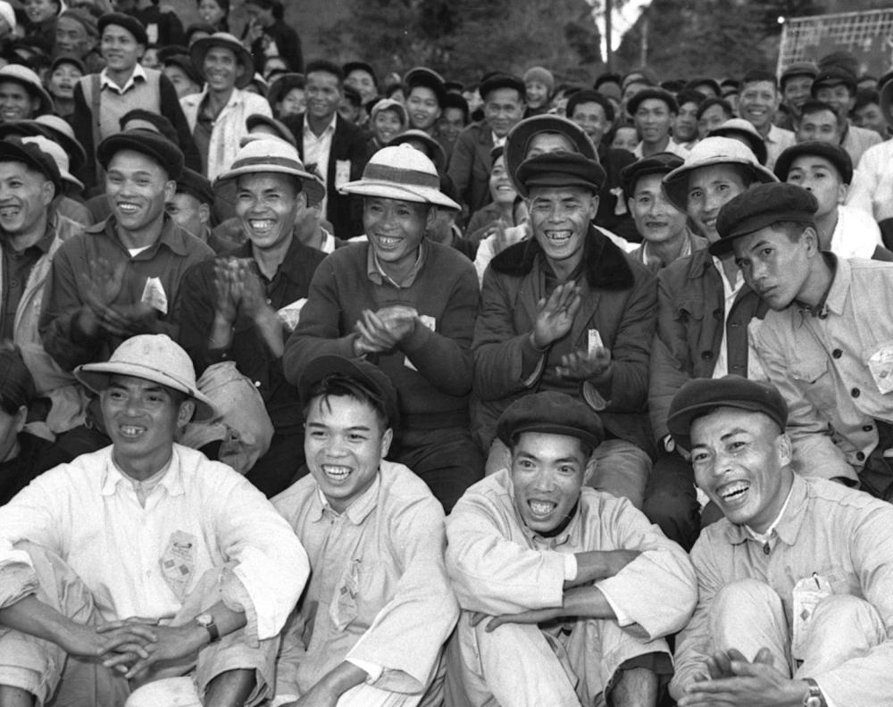 1959年12月,來自越南的客人在兩國邊境居民慶祝共建水利工程完工聯歡會上觀看演出。