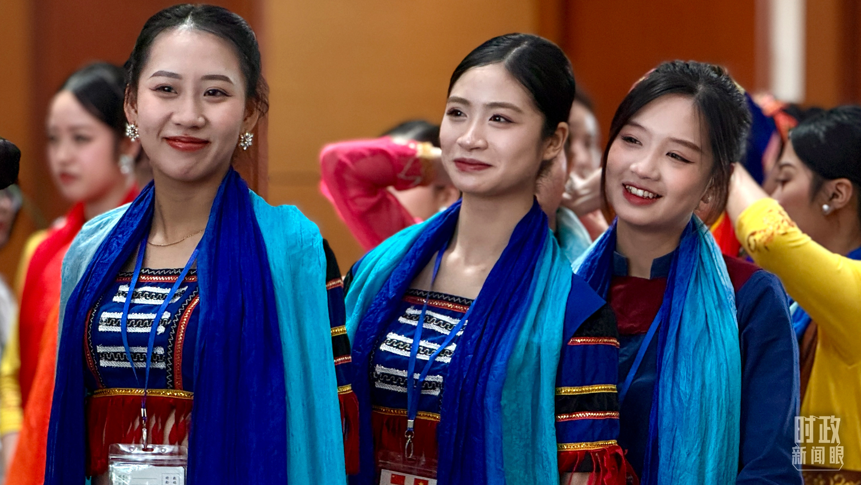 當(dāng)?shù)厍嗄晟碇褡宸b等待迎接習(xí)近平總書記。(總臺央視記者謝曉光拍攝)