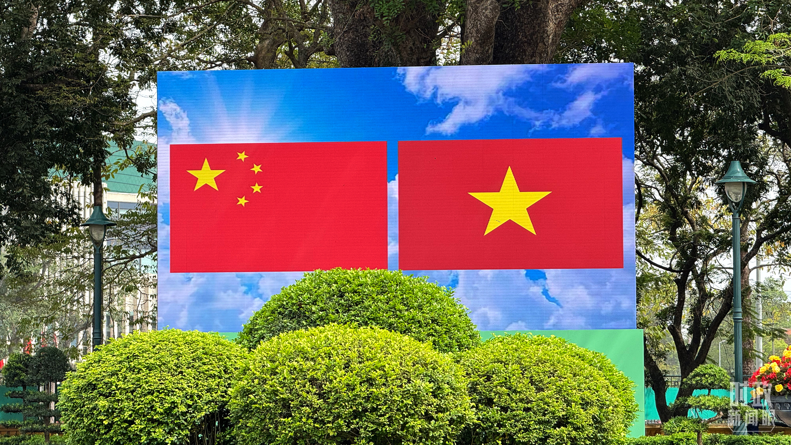 歡迎儀式現(xiàn)場大屏幕上展示的中越兩國國旗。(總臺央視記者蔣碩拍攝)
