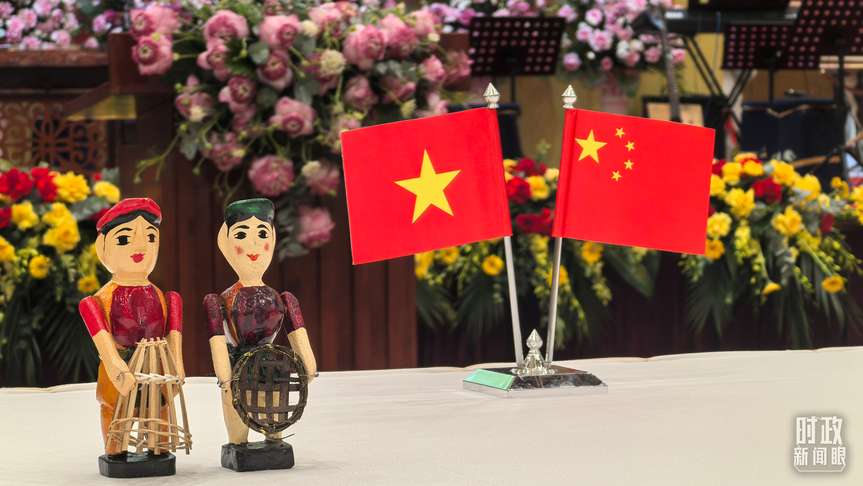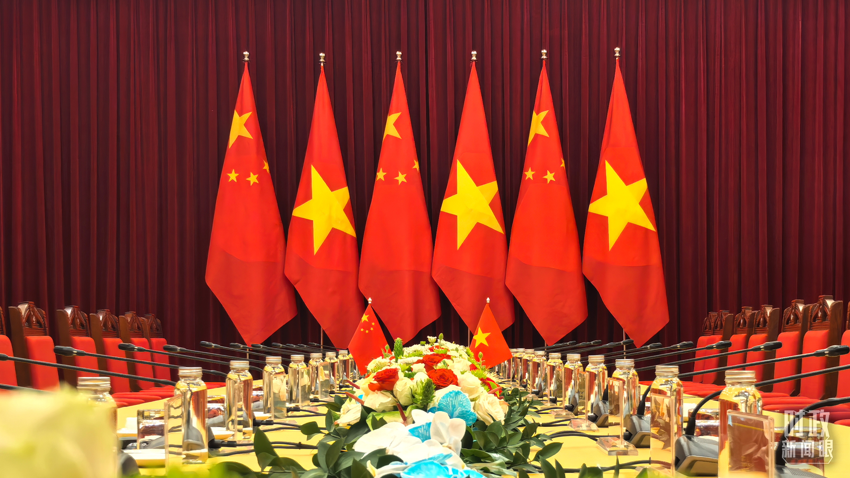 歡迎宴會現(xiàn)場擺放的中越兩國國旗。(總臺央視記者鄂介甫拍攝)