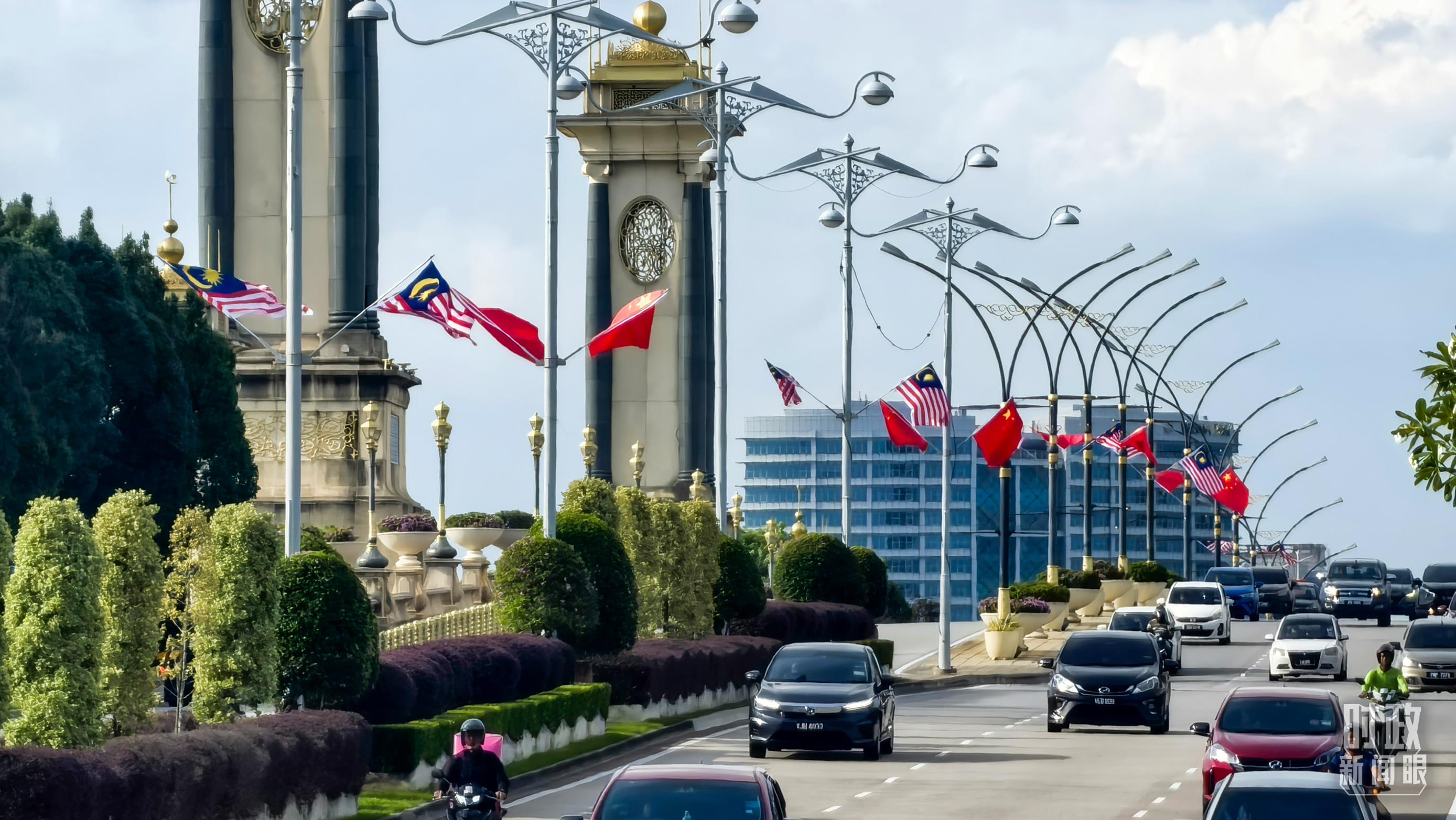 布特拉加亞街頭,中馬兩國國旗迎風飄揚。(總臺央視記者劉岳拍攝)