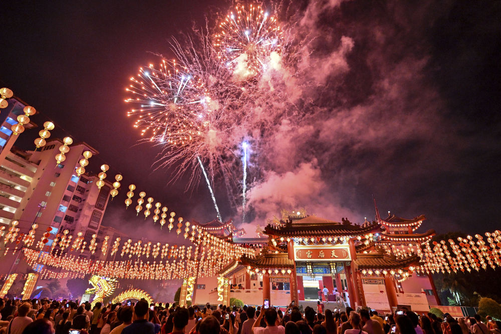 2024年2月24日,馬來(lái)西亞首都吉隆坡天后宮的煙花表演,吸引眾多市民到場(chǎng)一同慶祝元宵佳節(jié)。