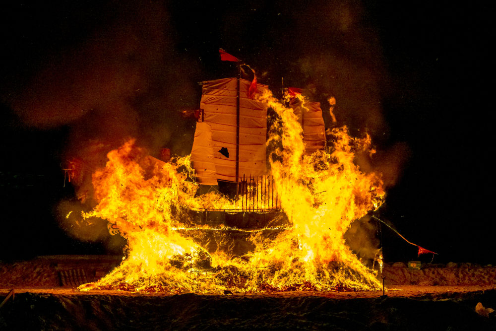 送王船是廣泛流傳于我國(guó)閩南地區(qū)和馬來(lái)西亞馬六甲沿海地區(qū)禳災(zāi)祈安的民俗活動(dòng)。2020年,中國(guó)與馬來(lái)西亞聯(lián)合申報(bào)的“送王船——有關(guān)人與海洋可持續(xù)聯(lián)系的儀式及相關(guān)實(shí)踐”項(xiàng)目,被列入聯(lián)合國(guó)教科文組織人類(lèi)非物質(zhì)文化遺產(chǎn)代表作名錄。這是2020年11月16日,在馬來(lái)西亞馬六甲,人們點(diǎn)燃“國(guó)安號(hào)”王船。