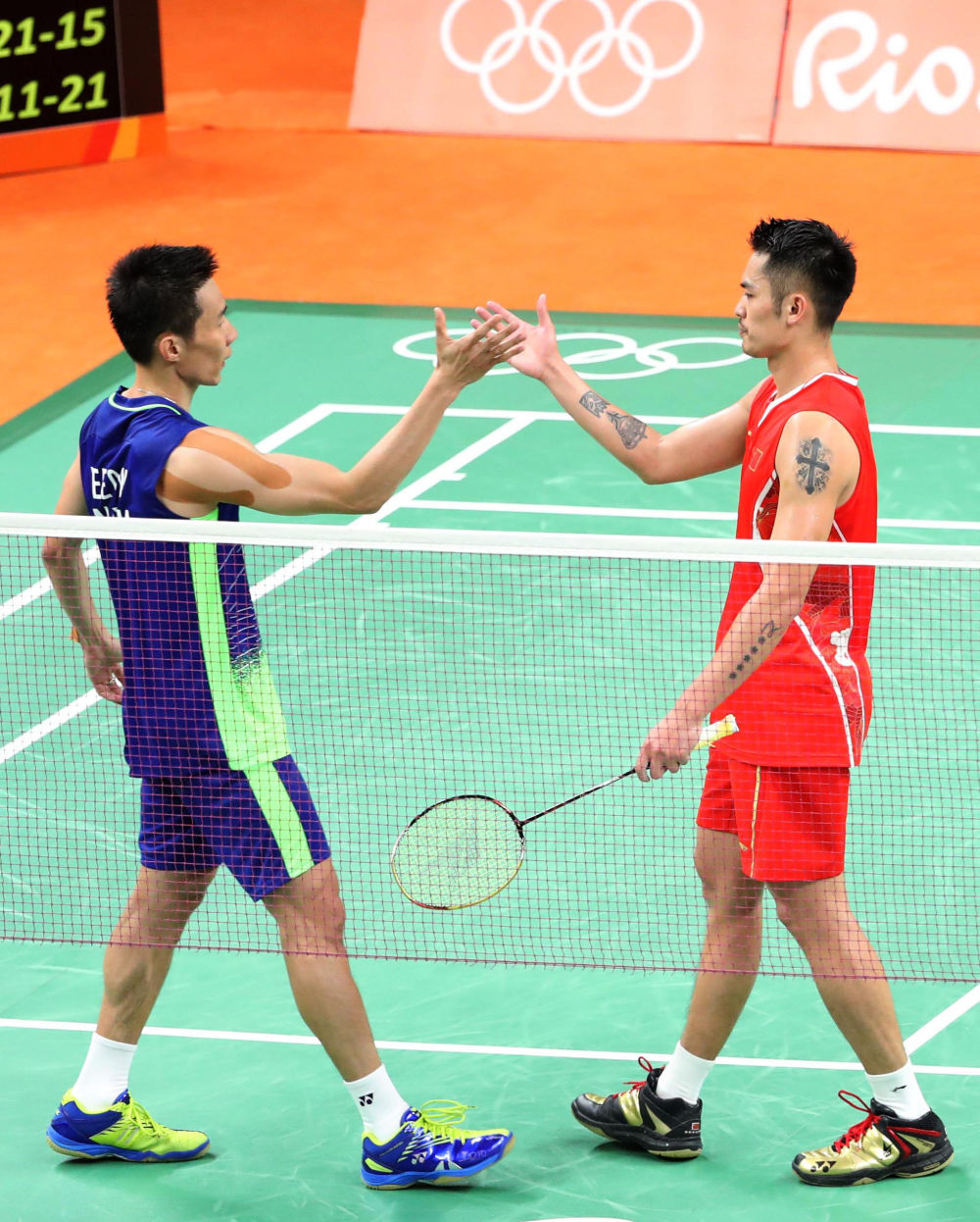 2016年8月19日,里約奧運(yùn)會(huì)羽毛球男子單打半決賽后,馬來(lái)西亞選手李宗偉(左)和中國(guó)選手林丹握手致意。