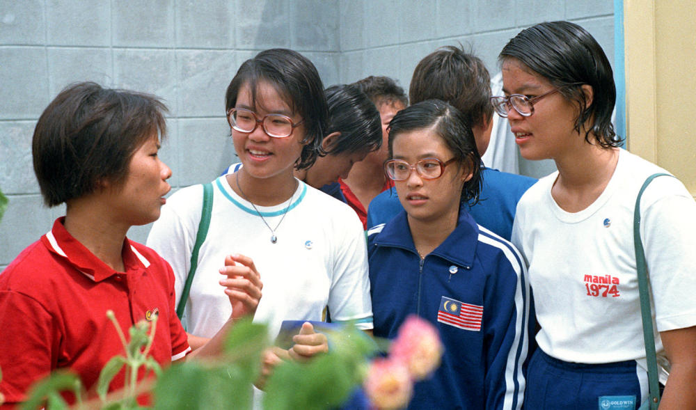 1975年8月2日至8月10日,北京國(guó)際游泳、跳水友好邀請(qǐng)賽舉行。一同參加這次邀請(qǐng)賽的馬來(lái)西亞游泳三姐妹林寶齡(前右二)、林愛(ài)齡(前右一)、林勇齡(左二)和中國(guó)運(yùn)動(dòng)員葉玩嫦親切交談。