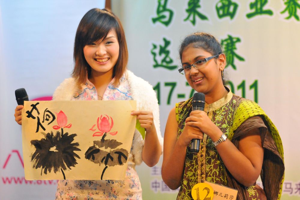2011年7月17日,參加世界中學(xué)生中文比賽馬來(lái)西亞賽區(qū)比賽的選手馬雅司(左)展示自己創(chuàng)作的水墨畫(huà)。