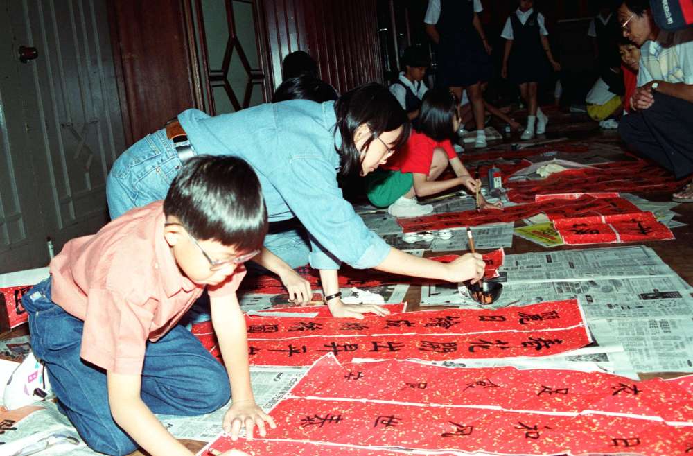 1995年,馬來(lái)西亞小書(shū)法愛(ài)好者揮筆獻(xiàn)技,書(shū)寫(xiě)漢語(yǔ)條幅。