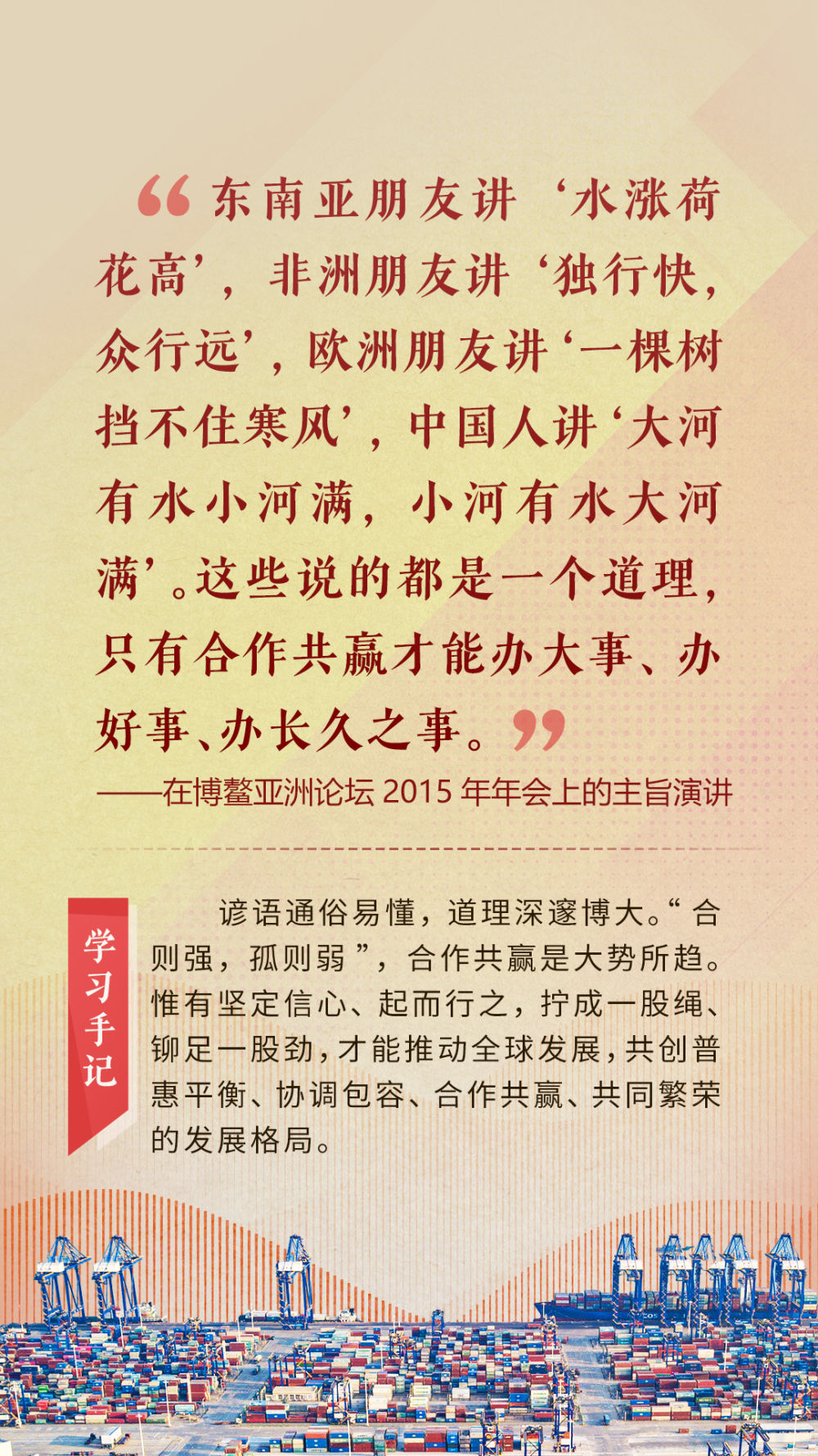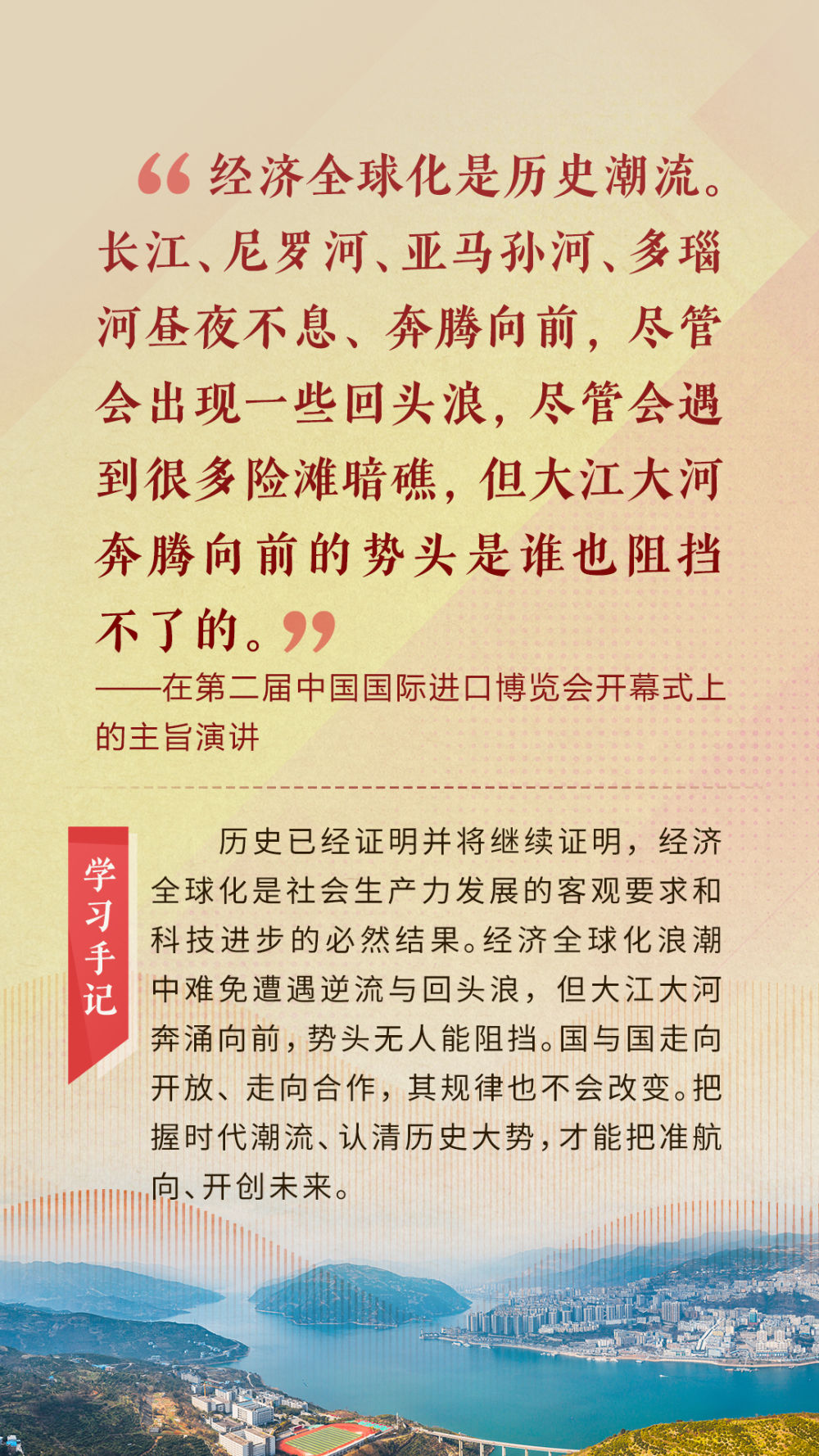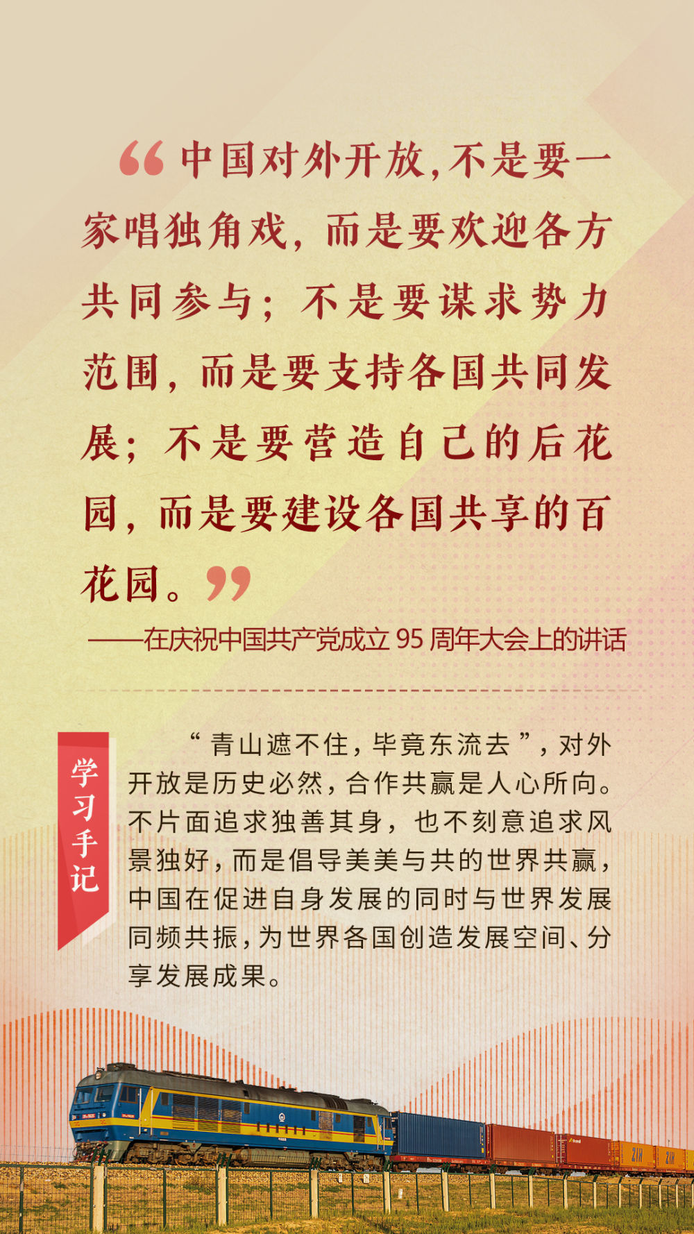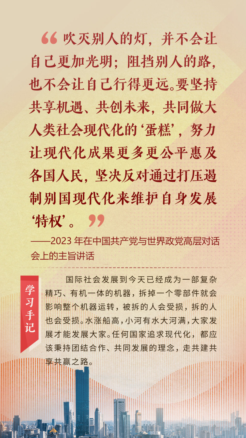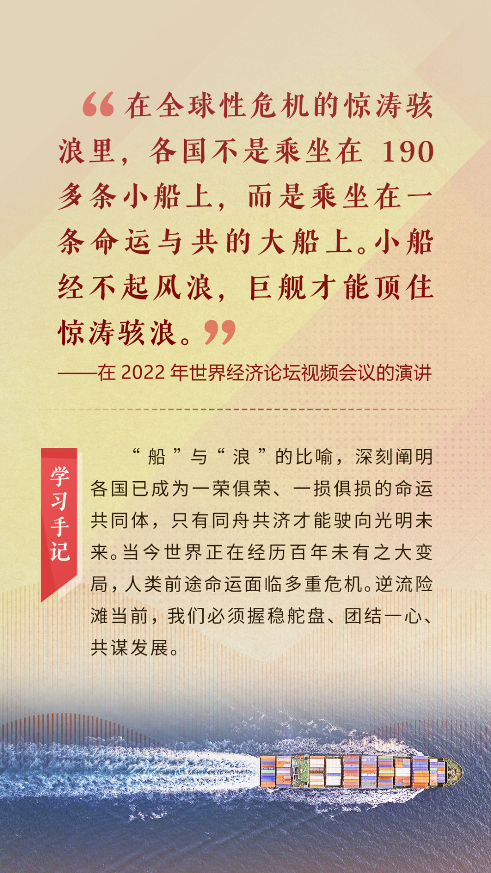 “天空足夠大,地球足夠大,世界也足夠大,容得下各國共同發展繁榮”“你中有我、我中有你的命運共同體”“與中國同行就是與機遇同行”……習近平總書記一次次在重要場合發表重要講話,指引我們站在歷史正確的一邊,站在人類進步的一邊,不畏浮云、登高望遠,不懼風浪、勇毅前行。