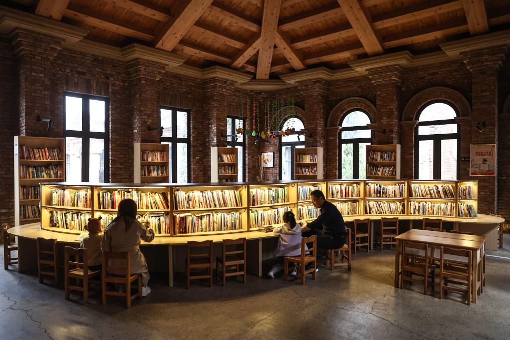 4月17日,小朋友在家長的陪同下在沈陽市鐵西區奉天工場文創園內的城市書房內讀書。新華社記者 潘昱龍 攝