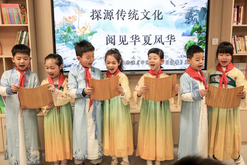 4月2日,湖北省武漢市洪山區未來實驗小學美林校區學生在吟誦古詩。新華社發(趙軍攝)
