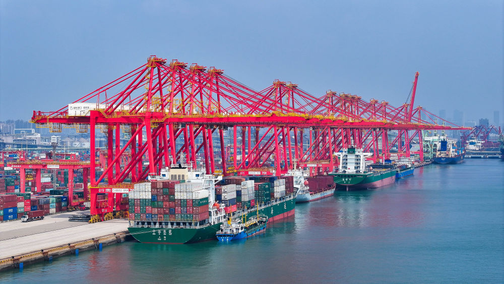 輪船在山東港口日照港集裝箱碼頭停泊作業(無人機照片,2024年8月22日攝)。新華社記者 李紫恒 攝