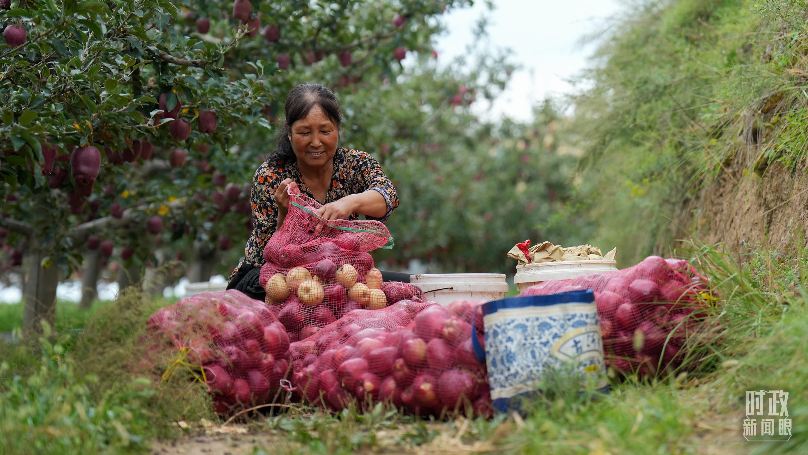 △甘肅天水市南山花牛蘋果基地帶動當地村民實現增收。(總臺記者李晉拍攝)