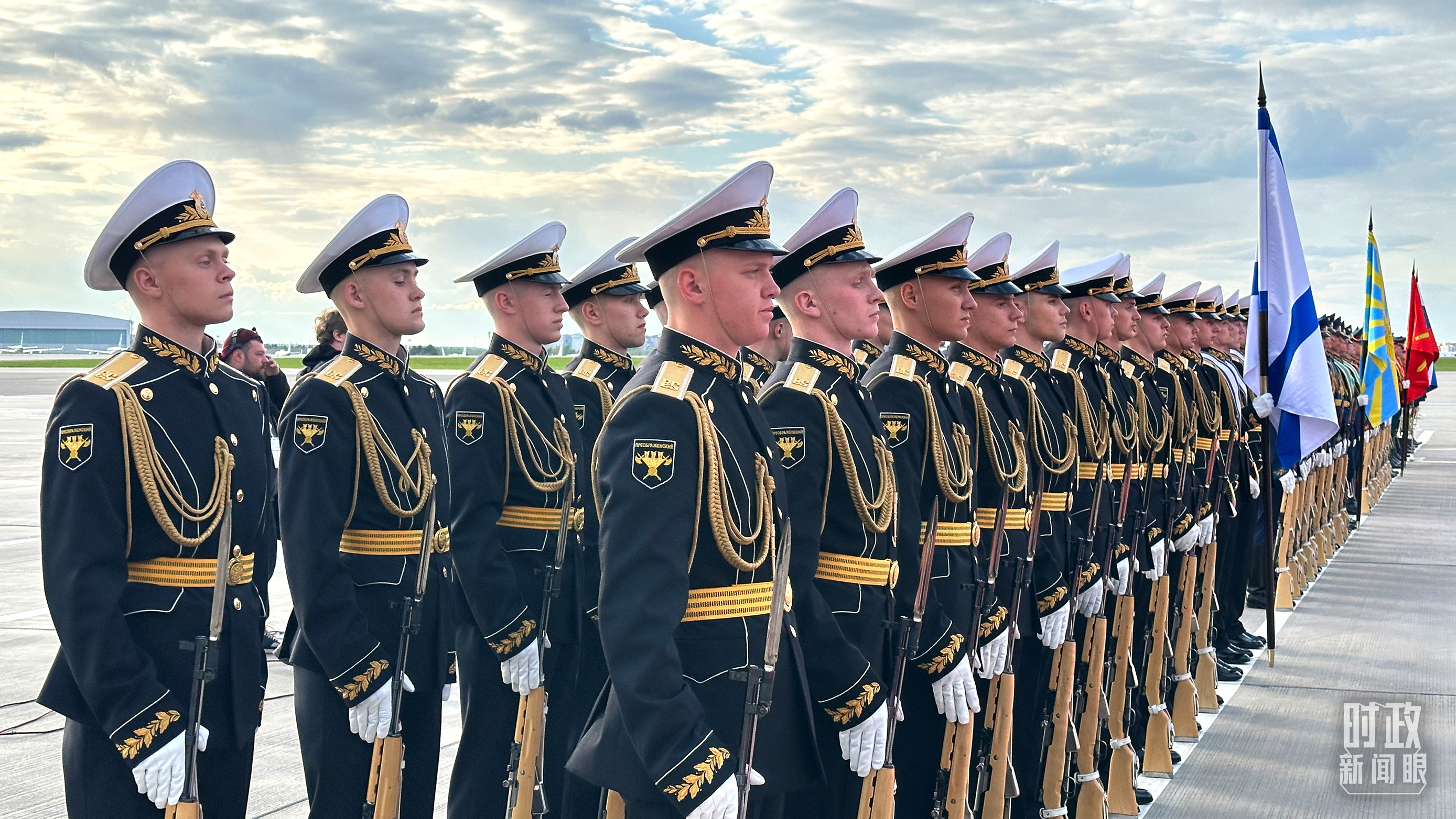 俄方在機場舉行隆重迎接儀式。軍樂團奏中俄兩國國歌。習主席檢閱儀仗隊并觀看分列式。