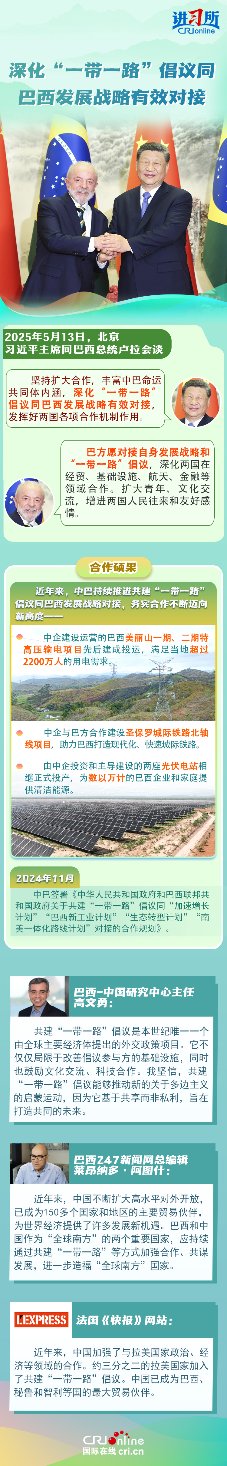 習近平主席在這三場雙邊外事活動中,均提到了共建“一帶一路”倡議:“深化‘一帶一路’倡議同巴西發展戰略有效對接”“要以哥倫比亞正式加入高質量共建‘一帶一路’大家庭為契機,推動兩國合作提質升級”“雙方要落實好共建‘一帶一路’合作規劃”……10多年來,在習近平主席親自擘畫和推動下,共建“一帶一路”從中國倡議走向國際實踐,取得了實打實、沉甸甸的成就。