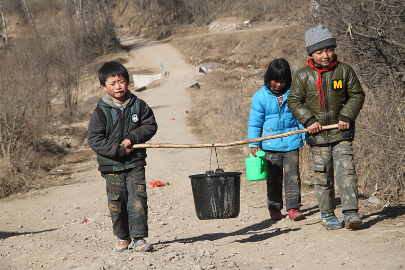 元古堆村的孩子們從取水點抬水。攝于2013年3月。新華社記者 范培珅 攝