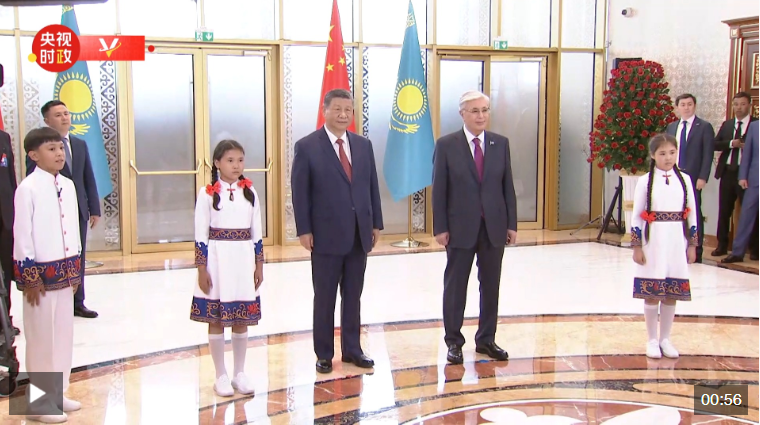 習近平抵達阿斯塔納納扎爾巴耶夫國際機場時,托卡耶夫總統率總統辦公廳主任達杰拜、副總理兼外長努爾特列烏、總統外事顧問卡濟漢、阿斯塔納市長卡瑟姆別克等高級官員熱情迎接。