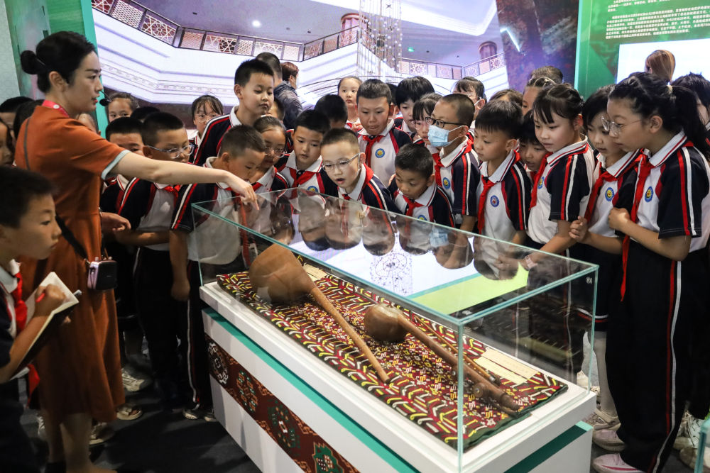 2023年9月7日,在甘肅敦煌舉行的第六屆絲綢之路(敦煌)國際文化博覽會上,學生們參觀土庫曼斯坦專題展。