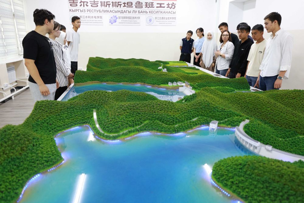 2025年6月4日,學生在吉爾吉斯斯坦首都比什凱克的魯班工坊水利樞紐工程模擬演示實驗室學習水電站知識。這家魯班工坊由浙江水利水電學院與吉爾吉斯斯坦國立技術大學等聯合建設,投入運行半年多來,已有4000多名學生在這里接受技術培訓。