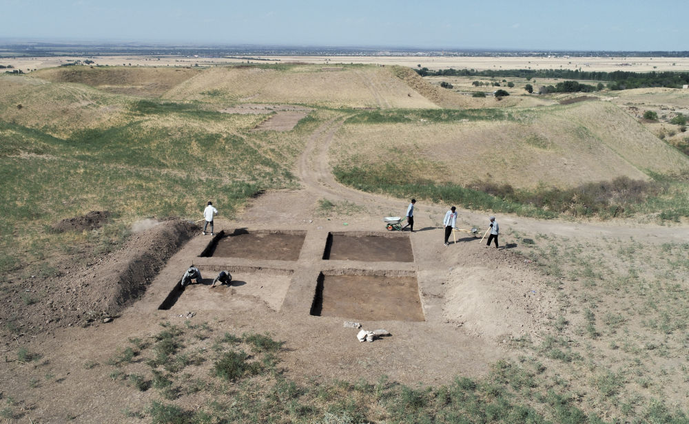 2023年8月9日,考古人員在中哈聯合考古項目拉哈特遺址探方上工作(無人機照片)。從2017年開始,陜西省考古研究院與哈薩克斯坦伊塞克國家歷史文化博物館組成聯合考古隊,對拉哈特遺址及附近相關遺址開展考古調查與發掘工作。