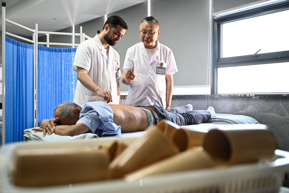 2025年4月18日,在南京中醫藥大學第二附屬醫院針灸康復科,李小龍(后左)在導師張建斌指導下給患者行針。南京中醫藥大學2023級針灸推拿專業的碩士研究生阿米爾中來自塔吉克斯坦首都杜尚別。中學時,他愛上了中國文化,給自己取了個中文名字“李小龍”。他刻苦學習中文,參加漢語橋中學生中文比賽,后來多次來到中國,與中醫結緣。2015年,李小龍到北京中醫藥大學學習針灸推拿,畢業后回到杜尚別開了自己的中醫診所。2023年,為了進一步提升自己,李小龍來到南京中醫藥大學攻讀碩士研究生。“今后,我希望把中醫帶到更多的國家,讓更多人感受中醫的妙處?!?/p>