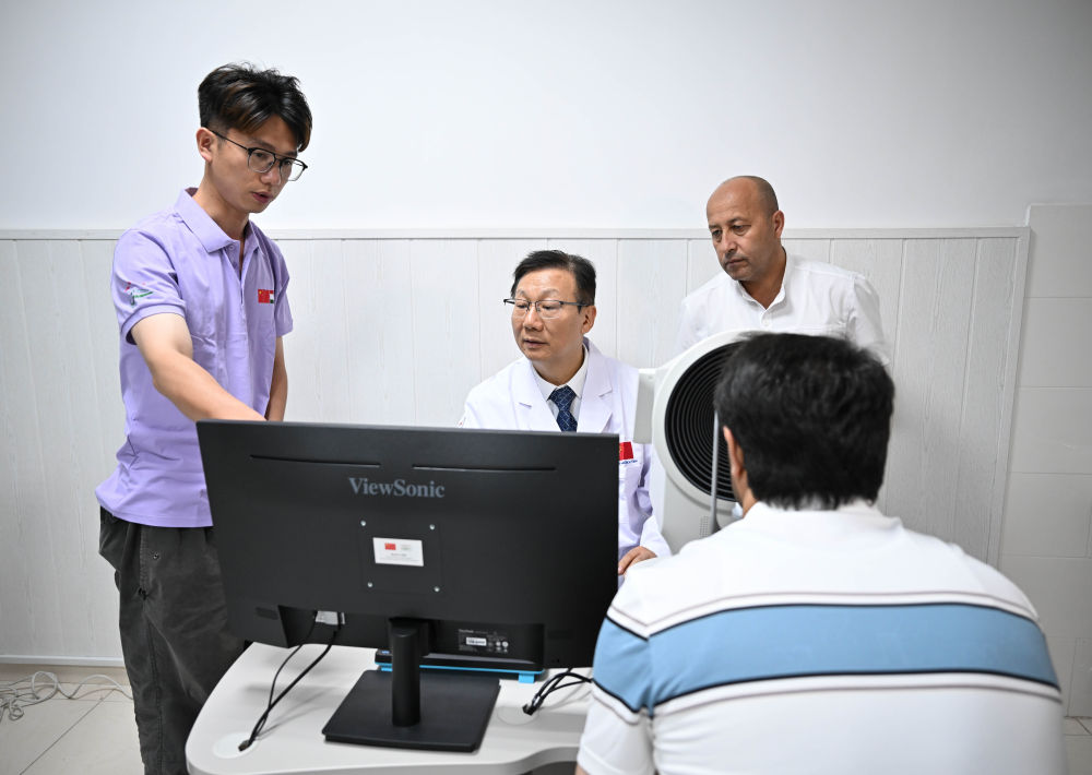 2025年5月31日,在塔吉克斯坦杜尚別,中國眼科專家黨光福(中)在防盲合作中心為當地市民做眼科檢查。當日,“健康快車中塔防盲合作中心”在塔吉克斯坦首都杜尚別開始運營。該中心旨在加強中塔兩國眼科醫療合作,促進雙方眼科醫護人員互訪培訓和學術交流,將惠及更多眼疾患者。