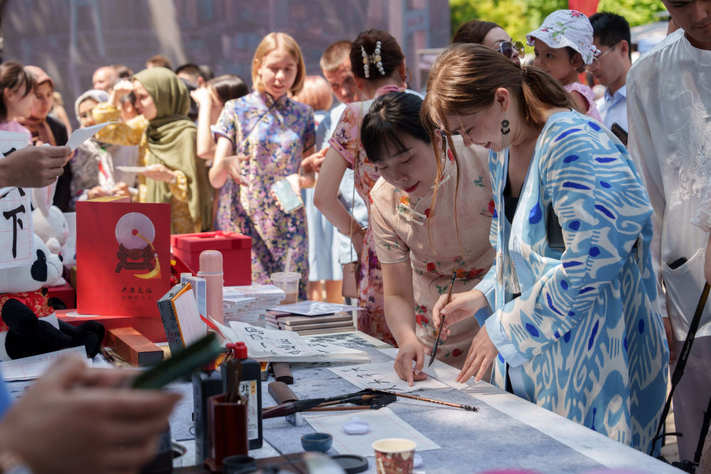 2025年4月19日,在哈薩克斯坦阿拉木圖,一名中國文化愛好者在“國際中文日”慶?;顒由象w驗書法。
