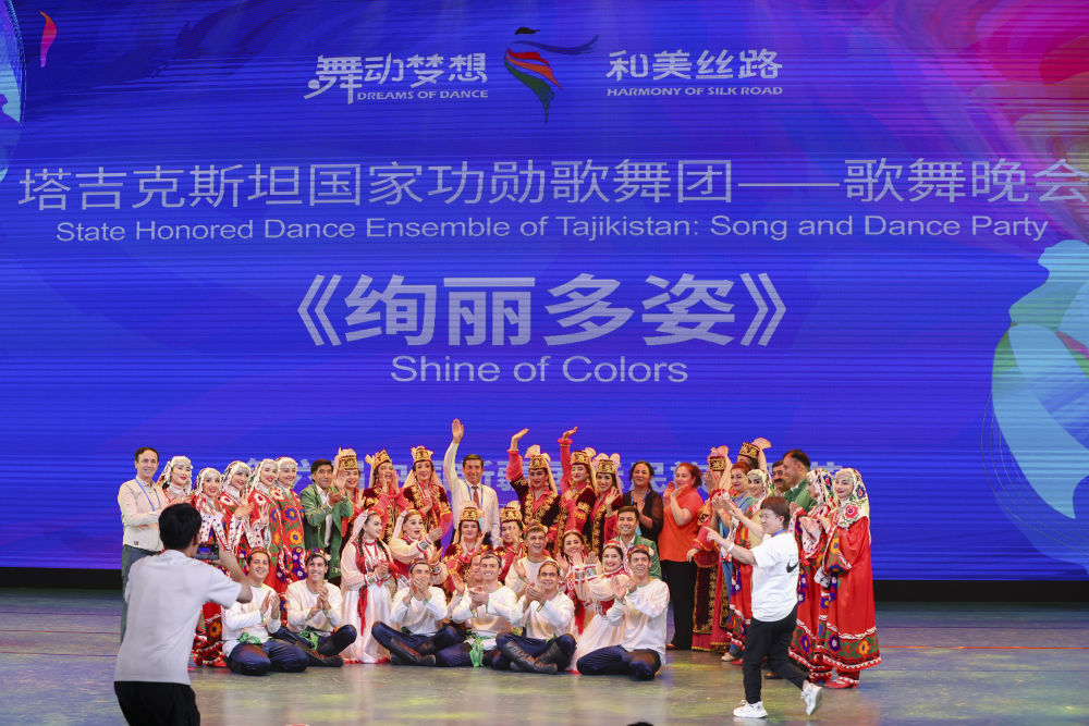 2023年7月27日,由塔吉克斯坦羅拉國家功勛歌舞團帶來的歌舞晚會《絢麗多姿》在新疆烏魯木齊晚報劇院上演。這是演員在演出結束后合影留念。