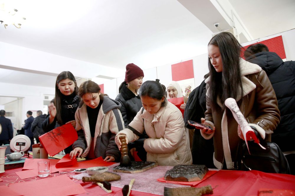 2023年12月26日,人們在吉爾吉斯斯坦比什凱克舉行的“一帶一路”暨中原文化交流展上體驗中國文化。本次展覽主要展出了以“拓傳春秋”為主題的石刻藝術及以“年畫”為主題的木刻和剪紙藝術作品。