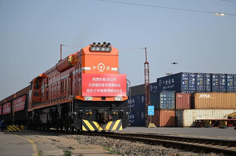 △5月20日,2025年首列天津港經霍爾果斯直達塔什干的中亞班列從天津港物捷三堆場發車。