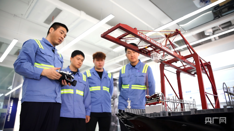 竺士杰(左一)為同事講解智能橋吊操作原理(央廣網記者 尚天宇 攝)